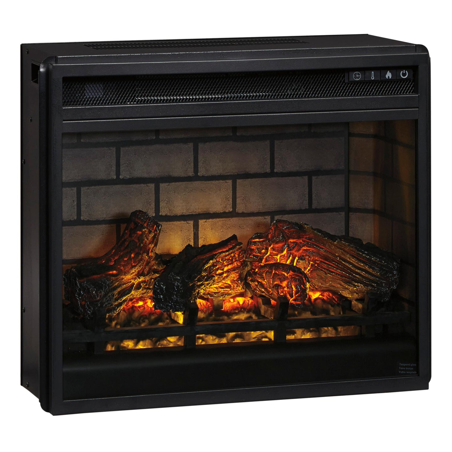 Enjoy the cozy feel of a cracklin’ fireplace without the hassle, maintenance or cleanup. Available as an addition on select TV stands and entertainment centers, this fireplace insert with faux firebrick surround operates with or without infrared heat and includes a multi flame feature, 7-level temperature setting, five brightness levels and an LED glowing embers effect.