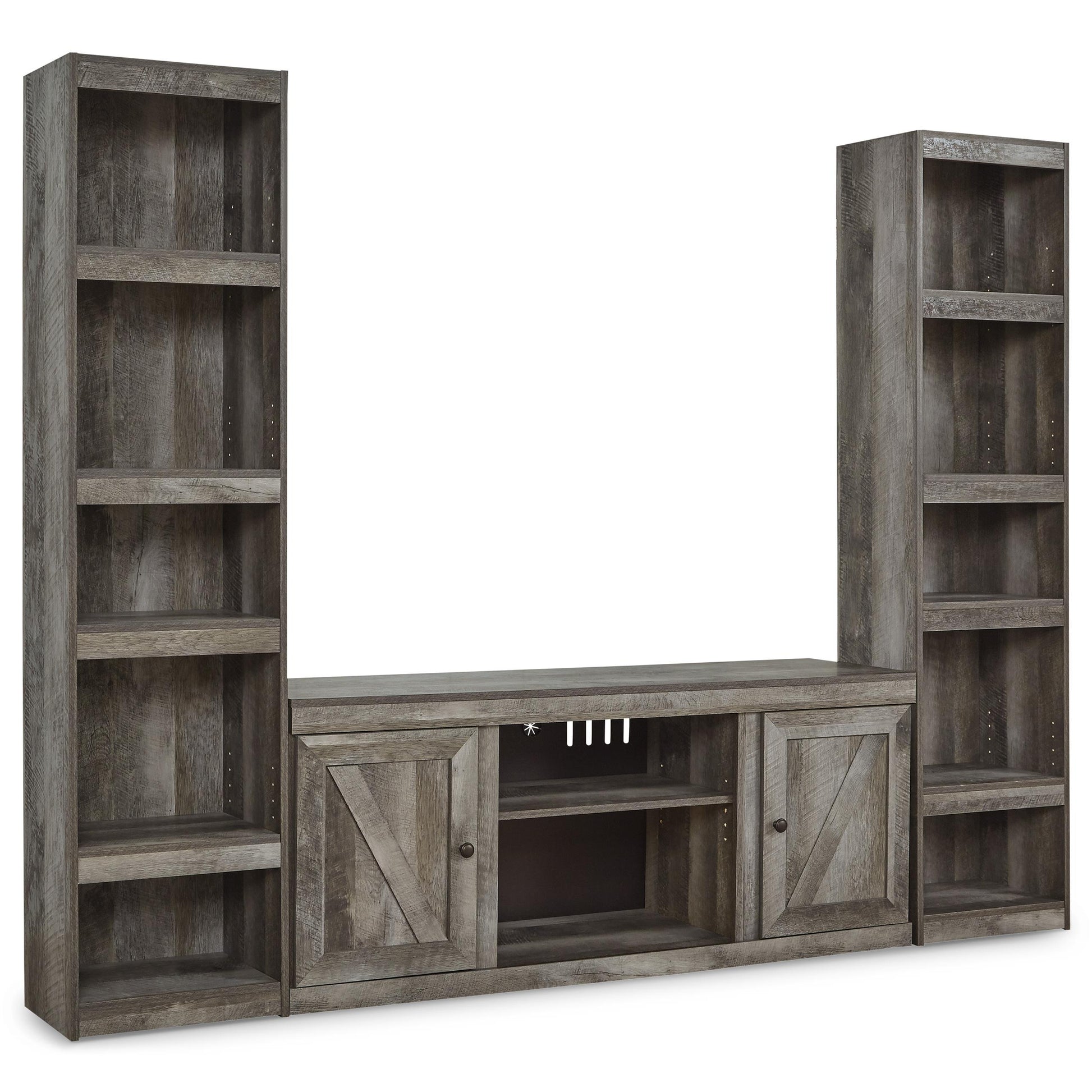 This entertainment center is sure to win your heart with its fresh take on country living. Its crisp, clean and minimalist-chic profile is enriched with a gray finish, striking replicated oak grain and thick plank styling for that much more authentic character. Crossbuck detailing adds a brilliant barn door-inspired touch. There's ample storage room, as well as plenty of open shelf space to showcase home accents, safely out of the way. Enjoy the cozy feel of a cracklin’ fireplace without the hassle of maintenance and cleanup by adding the optional fireplace insert (sold separately).