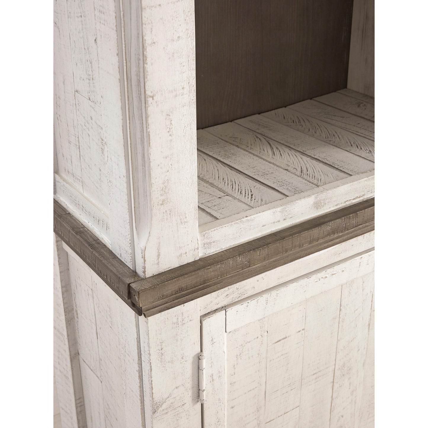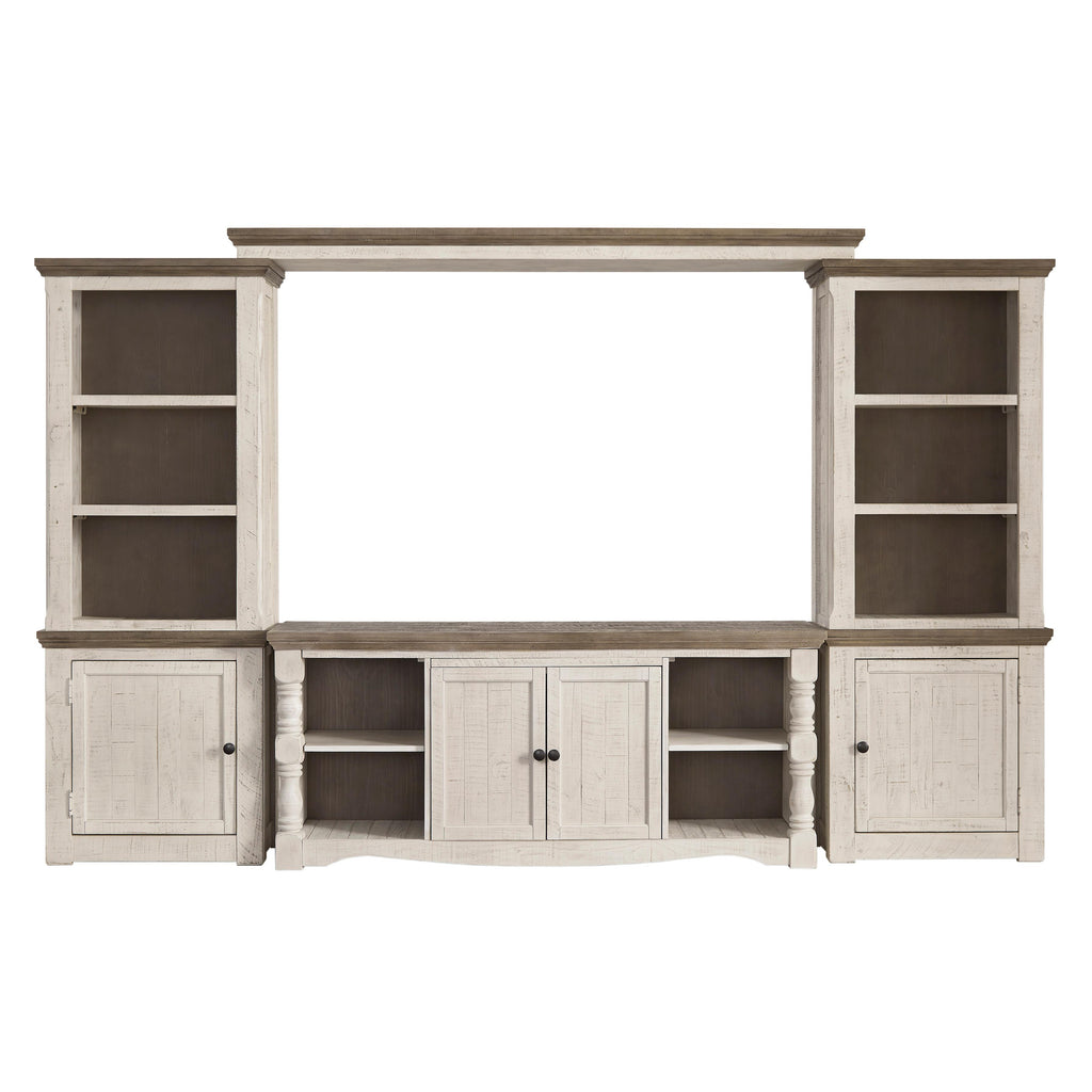 Set your sights on modern farmhouse style with this entertainment center. Distressed two-tone treatment blends a weathered gray with vintage white for an utterly charming effect. Turned posts lend a hearty, substantial look that feels right at home, while plenty of open shelving makes the aesthetic anything but heavy.