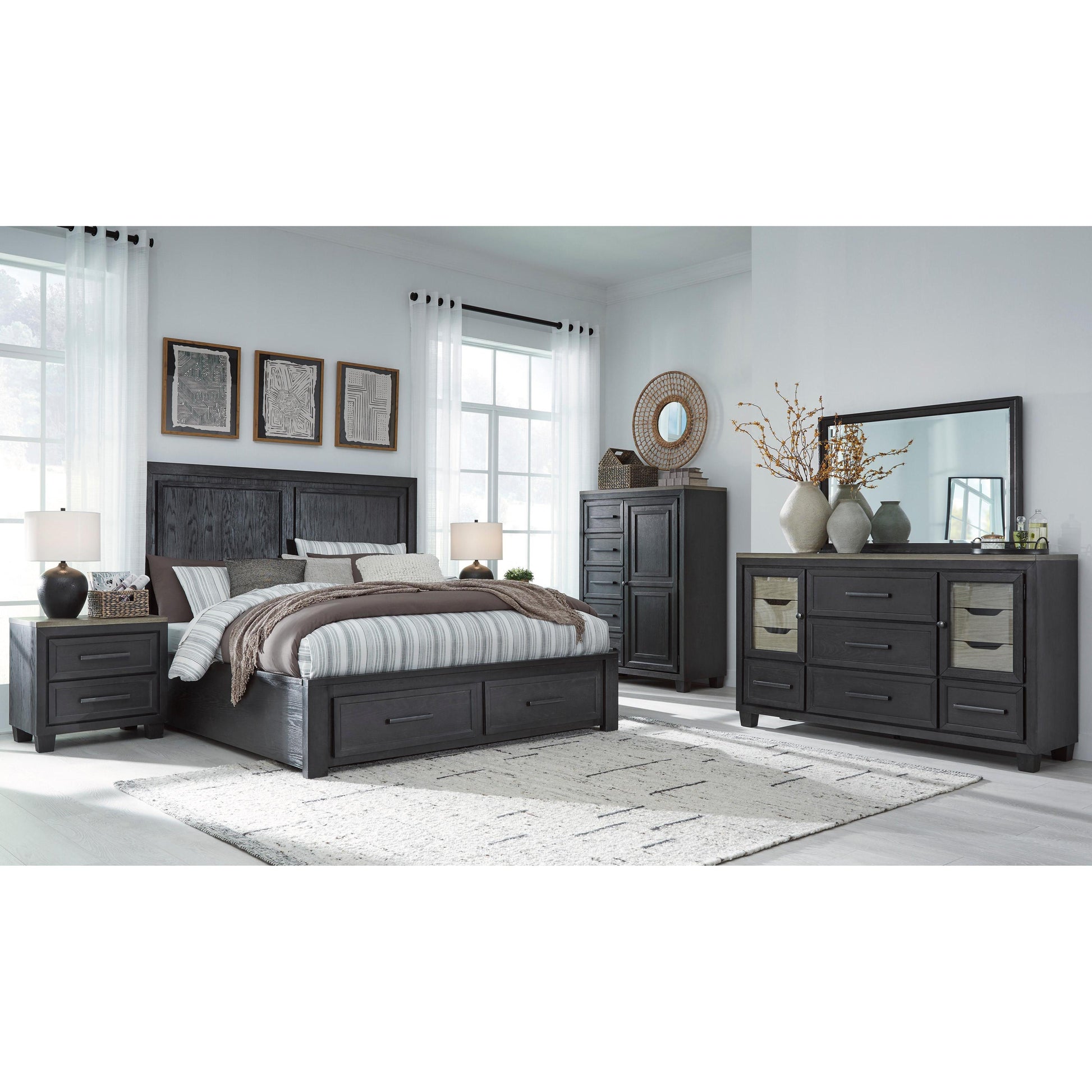 This Foyland 8-piece king panel bedroom set is casual style simply done right. It features a two-tone color scheme with storage drawers that generously accommodate your wardrobe needs with ease. This set includes a king panel headboard, footboard, rails, dresser, mirror, chest, and 2 nightstands.