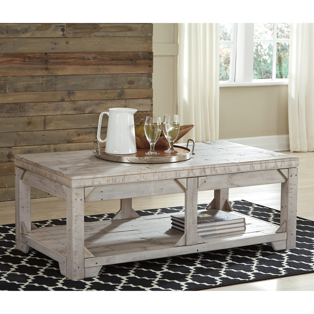 Take in the country fresh look of this occasional table set and reminisce of a simpler time. Its farmhouse style is evident in its stocky design with planked top/bottom shelf, unique triangle accents and relaxed white washed finish. You’ll love the casual feel and handcrafted look this ensemble brings to your living area. Plus, easy lift top feature accommodates eating or working in front of the television.