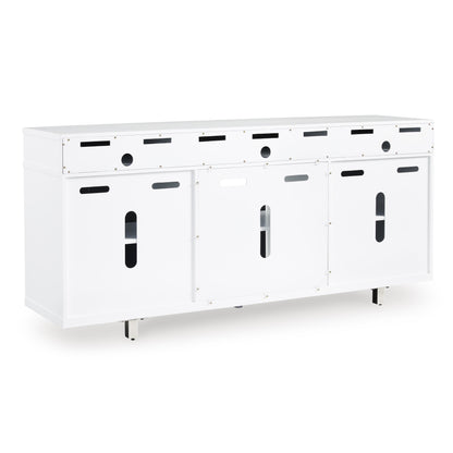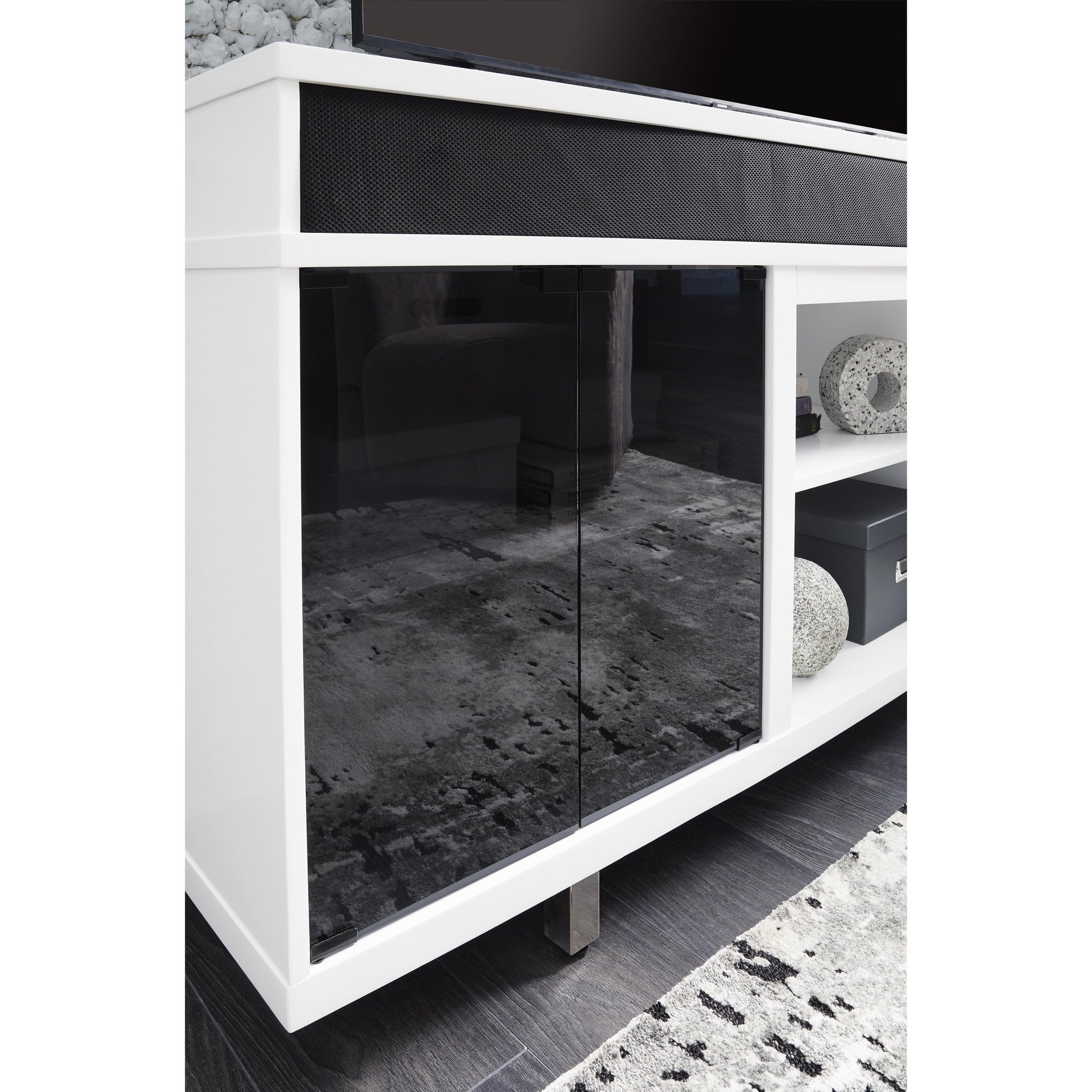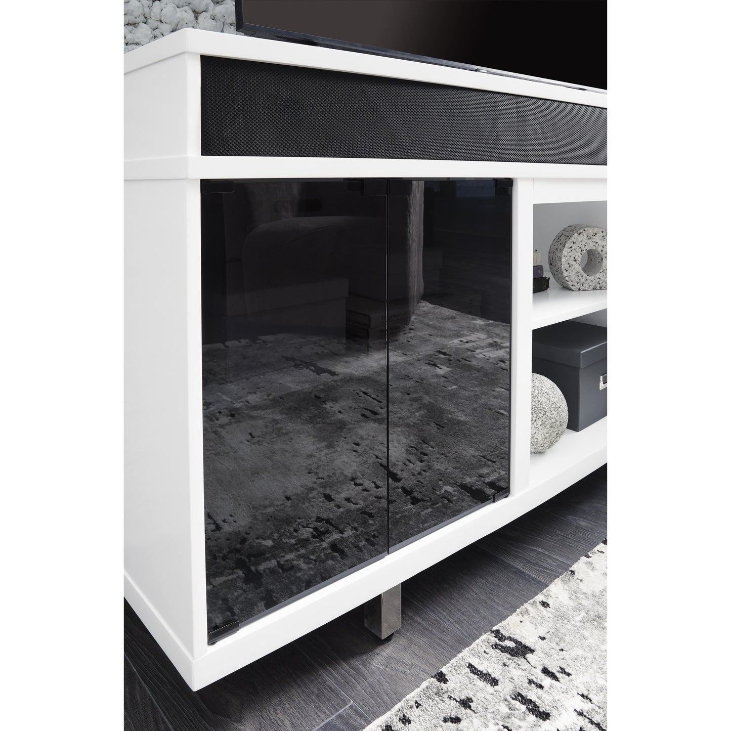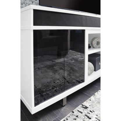 Combining a white high-gloss finish with black glass doors, this TV stand proves opposites really do attract. It's the perfect blend of modern style and functionality, with an electric fireplace option and ample space for your media devices, flat-screen TV and soundbar. What a smart choice on so many levels.