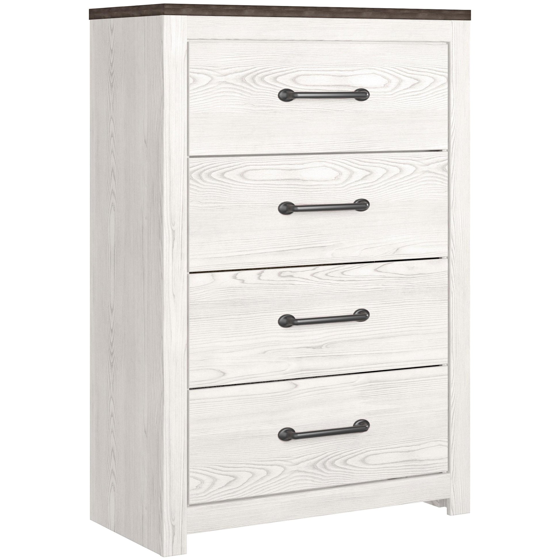 Cool, clean and casually modern. This Gerridan 7-piece bedroom set features a wispy whitewash and gray finish that sets the tone for your calming sanctuary. Matte black sconce lights and an abstract design on the headboard bring a fresh look. Large linear pulls add dimension and authenticity. Smooth-gliding drawers neatly accommodate your wardrobe needs. This set includes a king panel headboard, footboard and rails as well as a dresser, mirror, chest and nightstand.