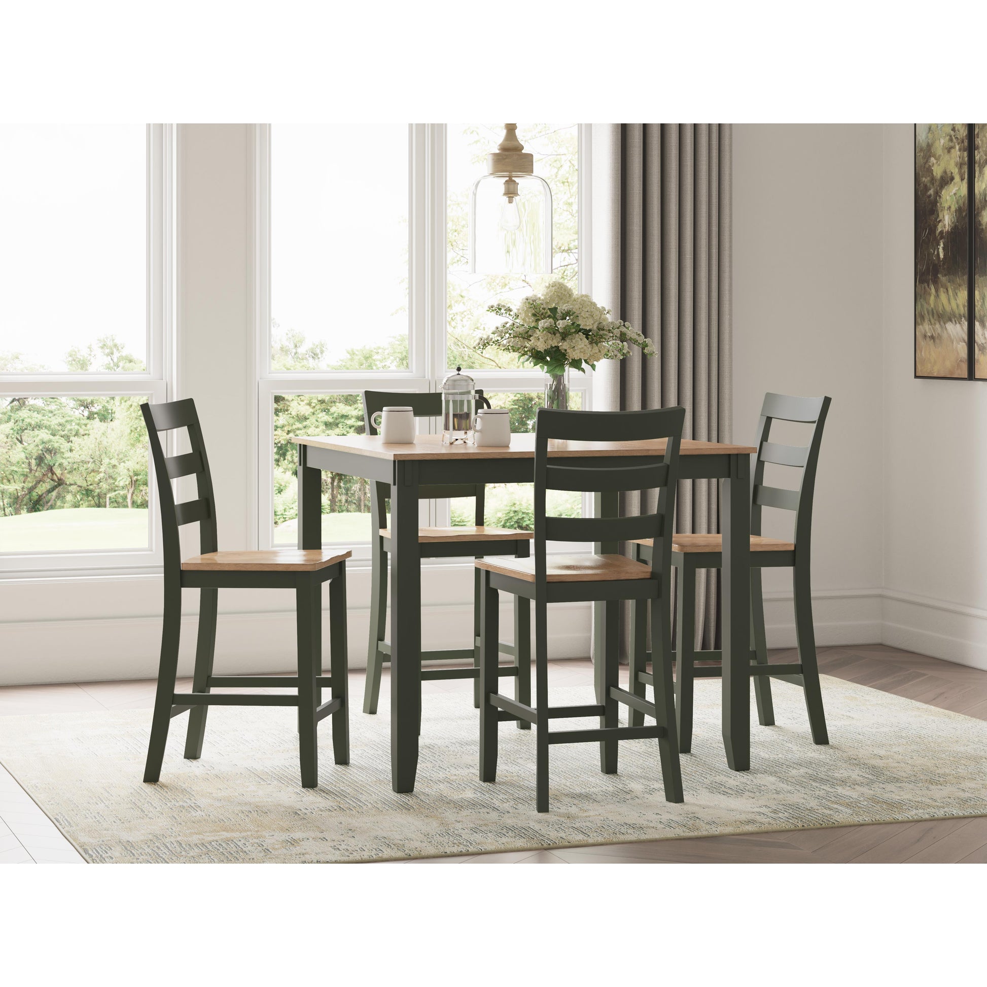 Complement your home’s simply relaxed sensibility with this counter height dining table and bar stools. A charming green hue offers a chic contrast to the natural wood tone, for a casual look that vibes with a variety of aesthetics. Whether you're sipping your morning coffee, settling in for dinner or working from home, this set is smartly designed for everyday comfort and style.