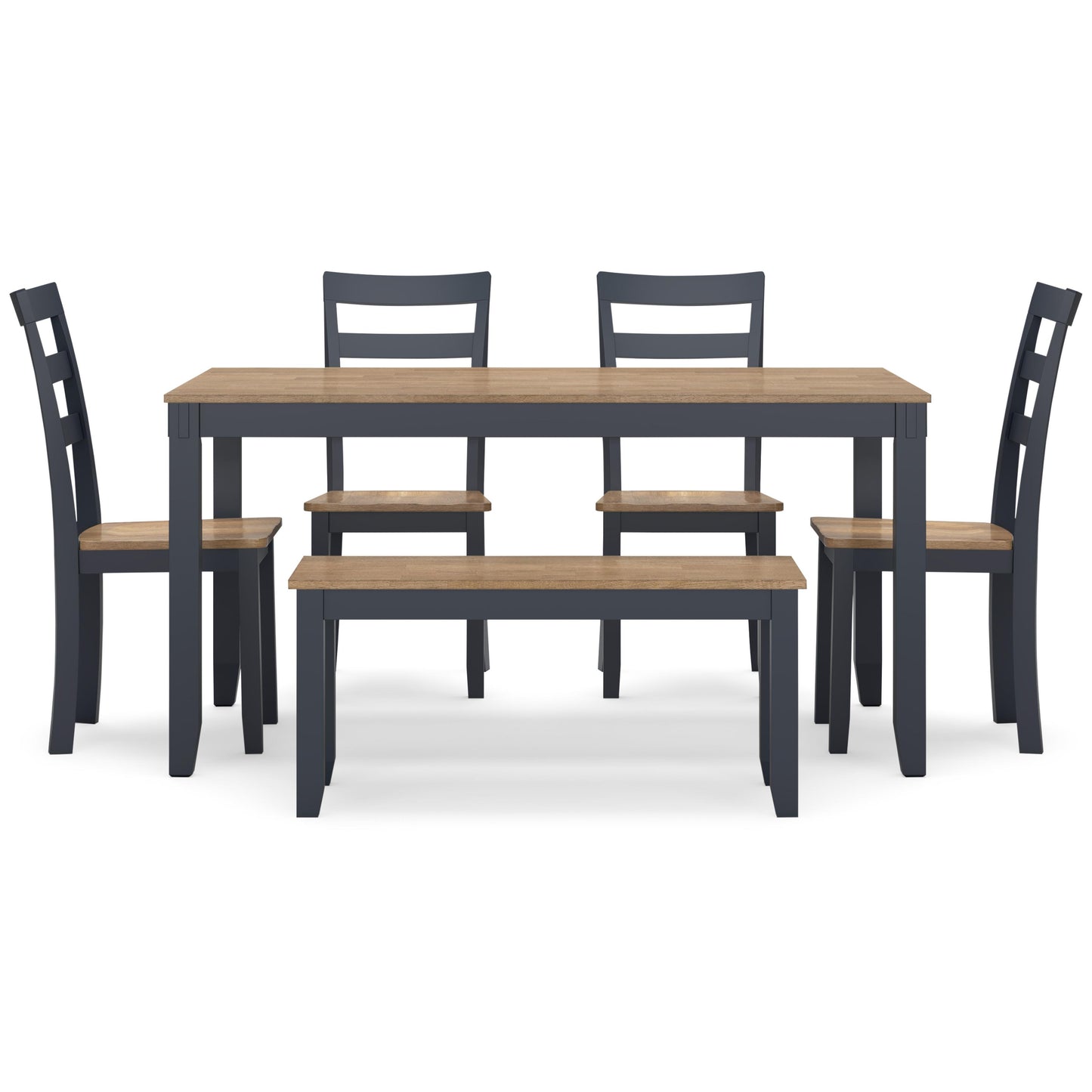 Complement your home’s simply relaxed sensibility with this dining table, chairs and bench. A dark blue hue offers a chic contrast to the natural wood tone, for a casual look that vibes with a variety of aesthetics. Whether you're sipping your morning coffee, settling in for dinner or working from home, this set is smartly designed for everyday comfort and style.