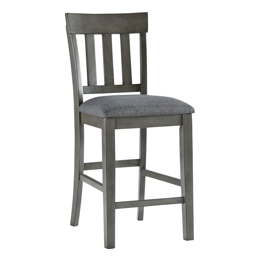 Cool and on-trend. This counter height dining set sports an antiqued gray color for a contemporary-yet-casual feel. The table features a storage base and removable leaf for extra seating room, making it a breeze to clear off clutter and expand your table space. The cushioned foam seat in a gray textural fabric pairs seamlessly with the antiqued gray finish, while the contoured comb-back design adds a dash of geometric flair. Dining with friends and family has never been so stylish. This set includes a table and four chairs.