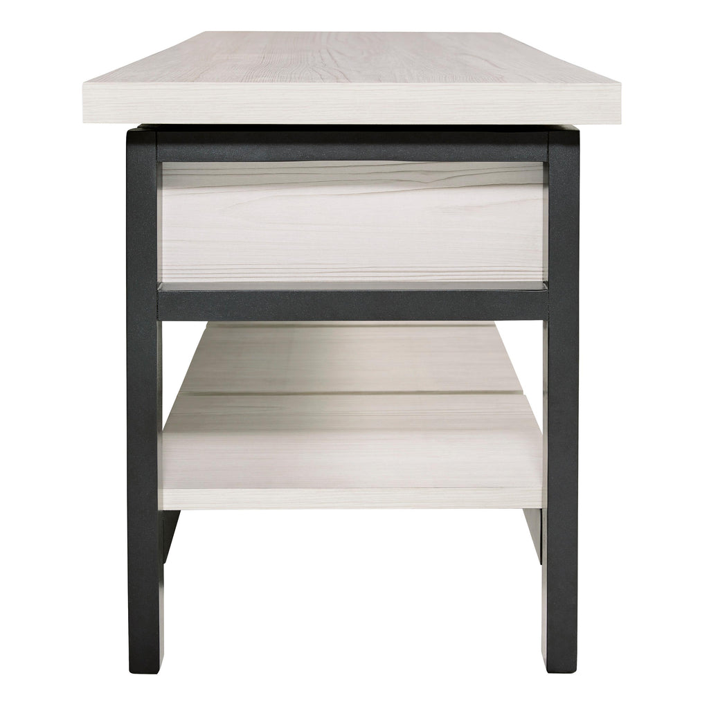Seating with style and storage—what more could you need? This storage bench has a hinged seat and plank shelf, making it the perfect multi-use piece. The white wood grain effect lends a casual touch, while the black finished legs and supports create a dynamic contrast.