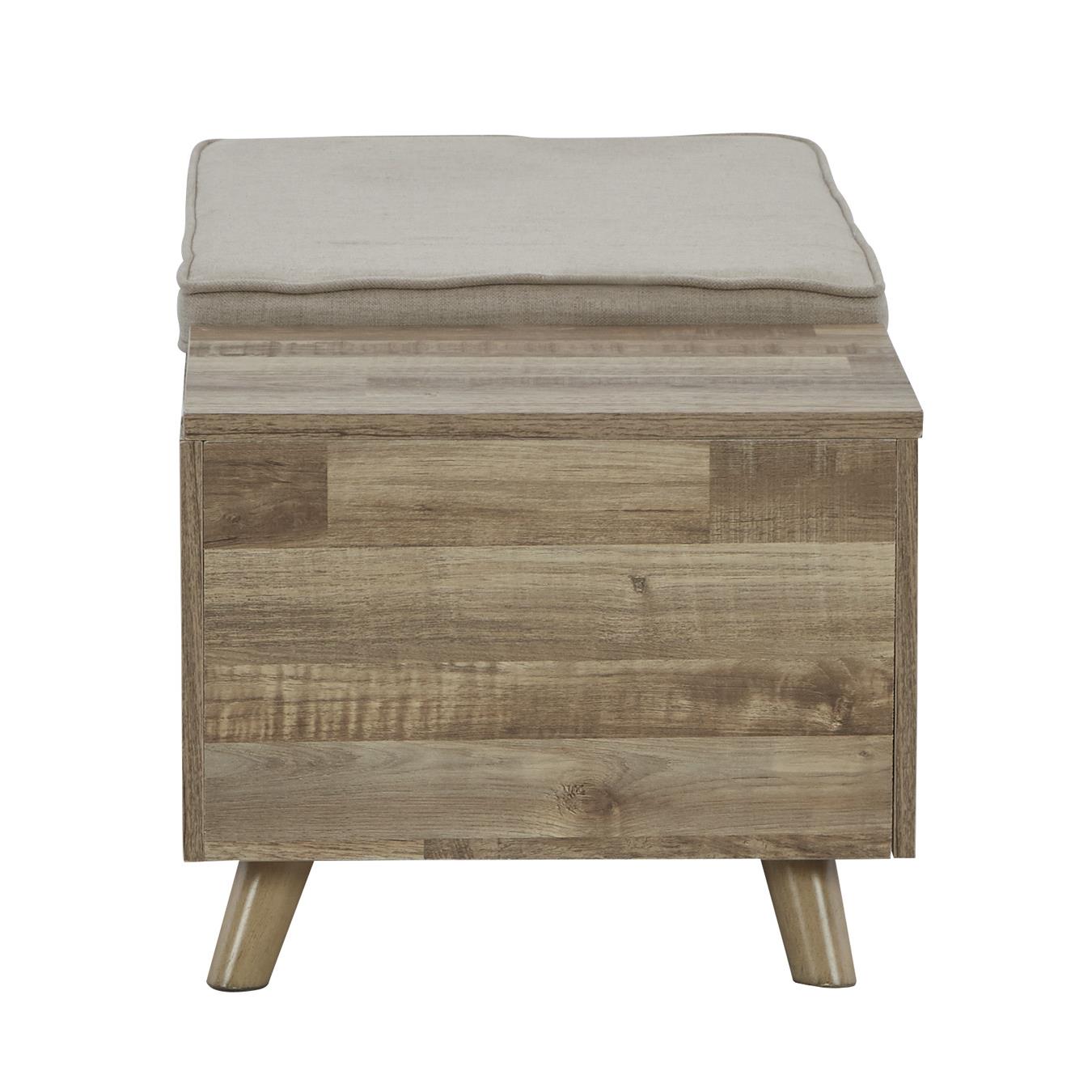 The clean profile of this small storage bench makes an entrance anywhere and everywhere you place it. A replicated butcher-block wood grain effect and tapered wood legs lend a fresh flair. Adding form and function, both tops are removable to expose hidden storage underneath. It’s a must-have piece for small spaces.