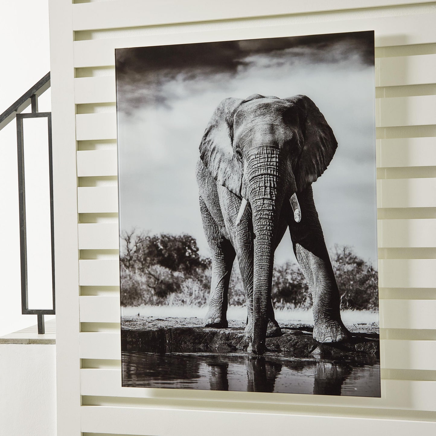 The elephant has long symbolized strength, intelligence and good luck. Celebrate this majestic creature and express your personality with this wall art. The black and white print on glass makes a bold and visually striking statement.