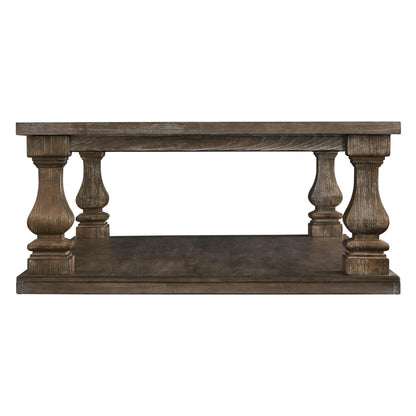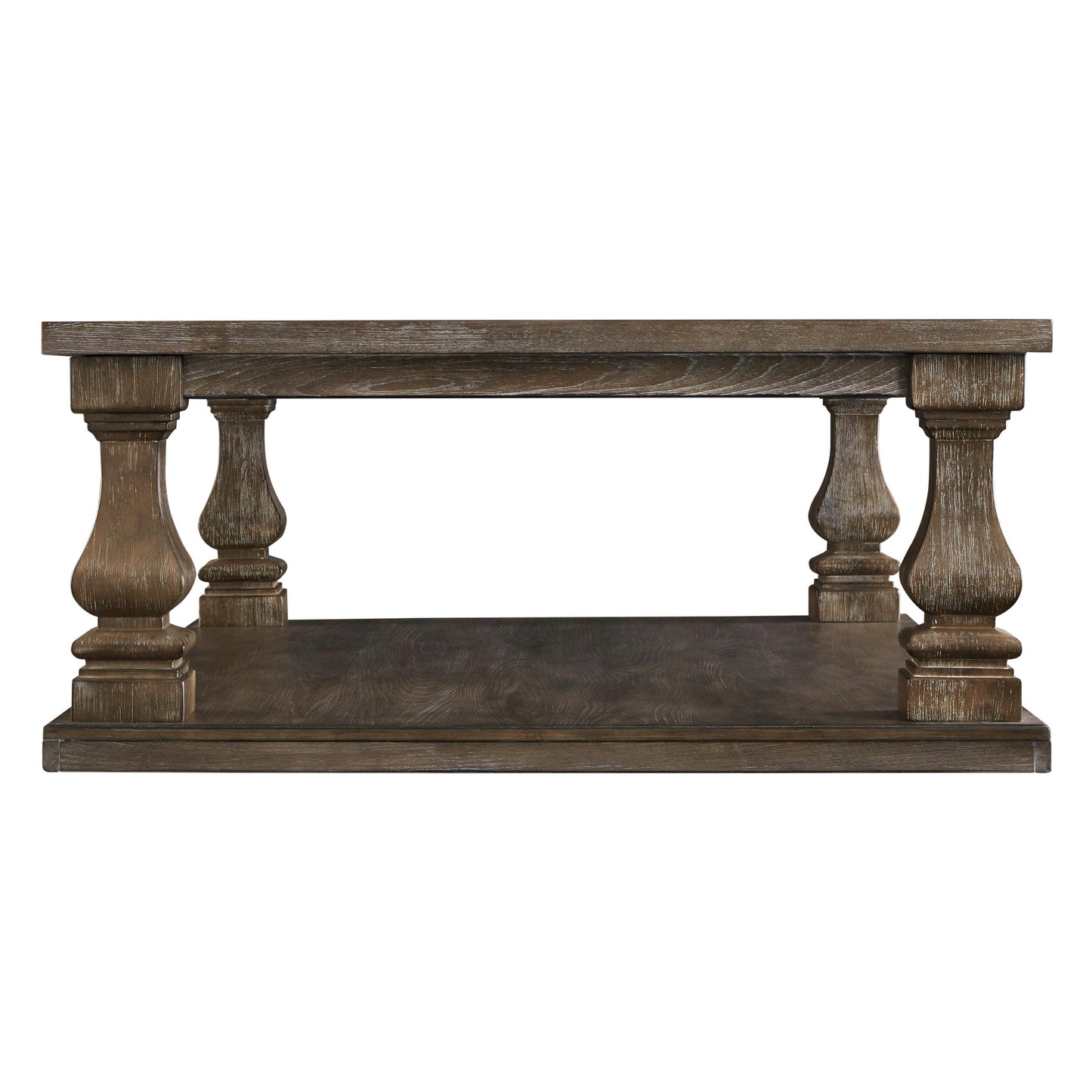 Homey. Hearty. Heavenly hued. Luring with a distressed weathered gray finish and square baluster legs set on a broad lower shelf for great presence, this coffee table is sure to make your homestead feel that much more like home. The look is beautified with elm veneers and a framed and plank-effect tabletop for a richly crafted masterpiece made for years of satisfaction.