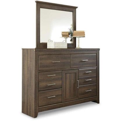Get the look of posh barn wood without setting foot in a salvage yard. Replicated rough-sawn oak of this bedroom package has a vintage finish that is reminiscent of a timeworn family heirloom. Warm, rustic and naturally beautiful, it's just got that ageless appeal. This set includes a California king headboard, footboard, rails, dresser, dresser mirror, chest, and 2 nightstands.