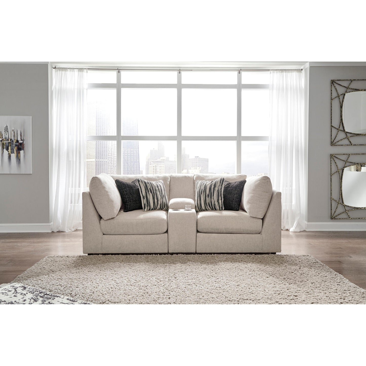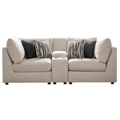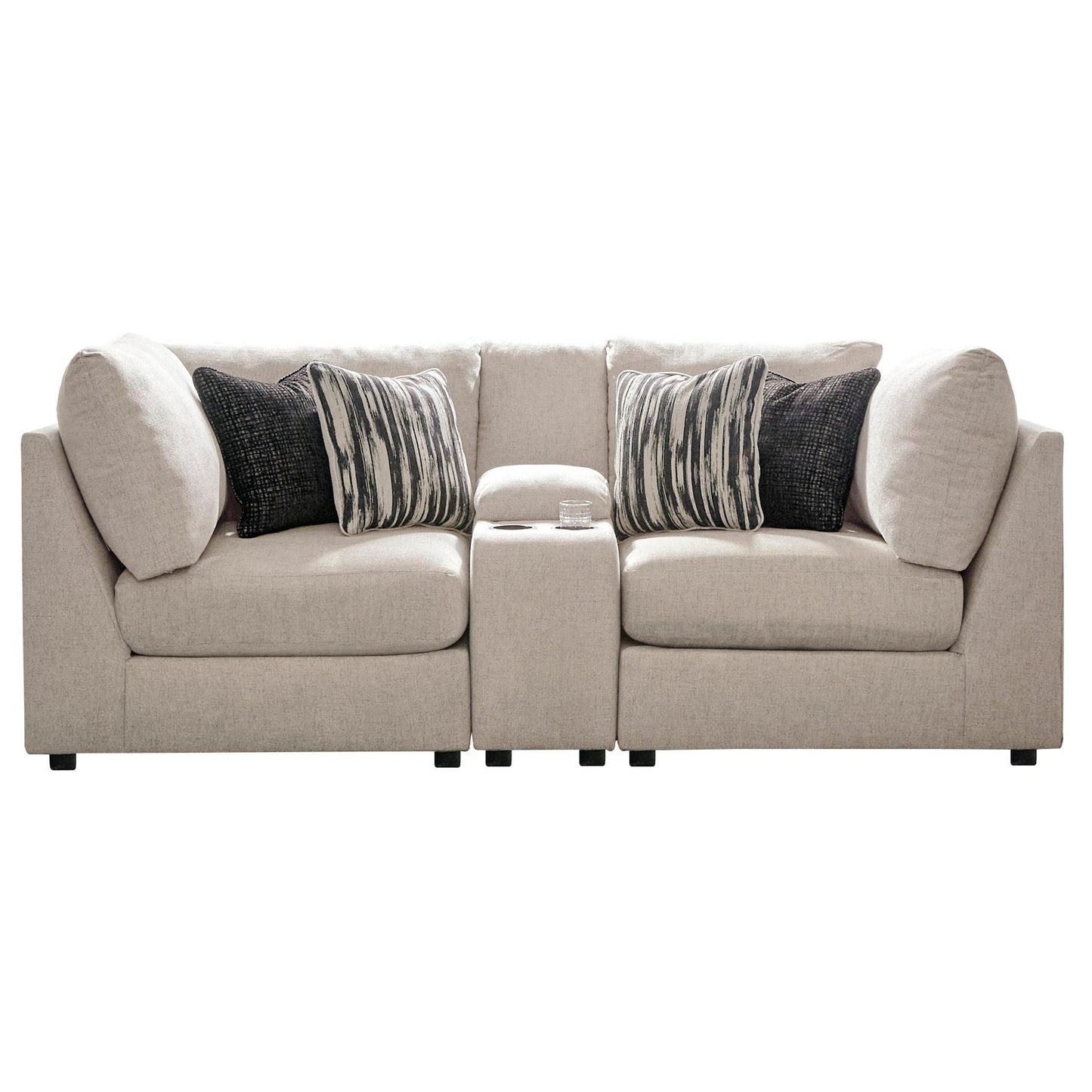 With its casual-contemporary aesthetic and modular design, this sectional makes way for high style and indulgent comfort. Rest assured, the thickly cushioned storage console includes not only a pair of cup holders, but also a USB port to keep you powered up while you unplug. Plush-to-the-touch chenille-feel upholstery in bisque beige is pure delight.