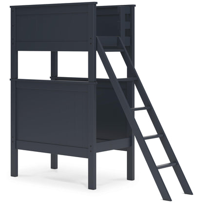 Maximize space and turn your kids' bedtime into an adventure with this cool twin-over-twin bunk bed with mattress set. It's an effortless addition to any bedroom, with a timeless Shaker style that's wonderfully finished in an on-trend blue. Guard rails on the top bunk help everyone get a good night's rest. And the simplified design means easy assembly. Who doesn’t like that?