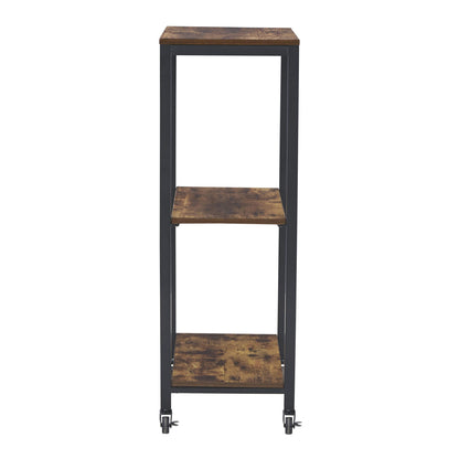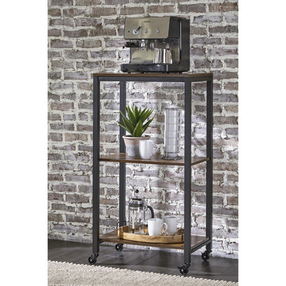Impress your party guests in style with this bar cart. It features a sturdy design, with black metal rails and an antiqued brown wood finish on the three shelves for a relaxed feel. Smooth-gliding casters offer easy mobility.