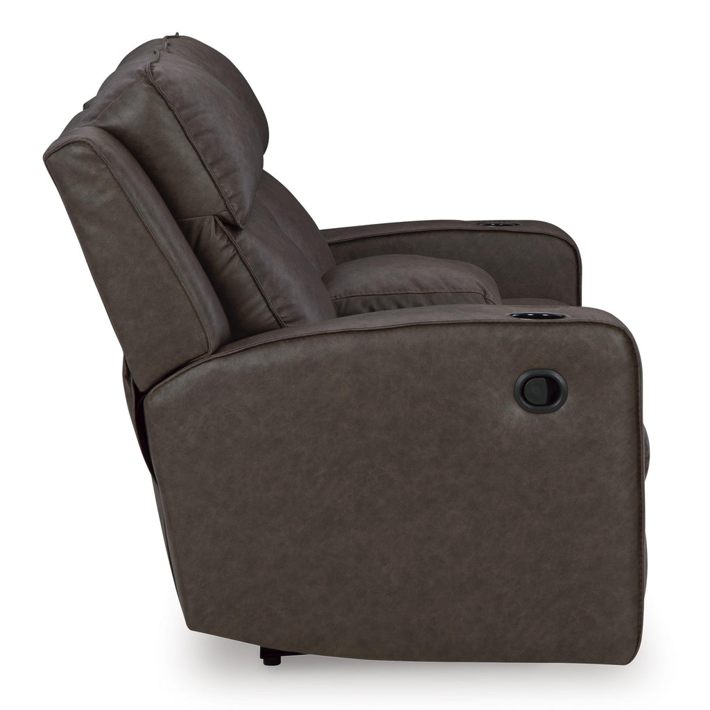 Indulge your lust for comfort and love for contemporary design with this reclining loveseat. Made for easy everyday living, it’s upholstered in a heavyweight padded faux leather and accented with contrast jumbo stitching for fashion-forward flair. Sleek track arms elevate the look with a touch of modern sensibility. A padded center console with dual cup holders completes the experience.