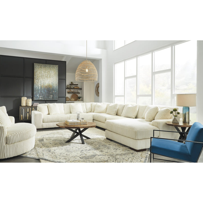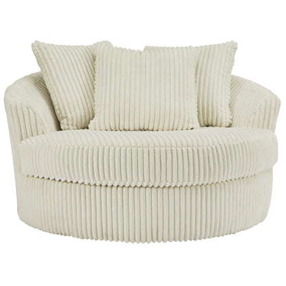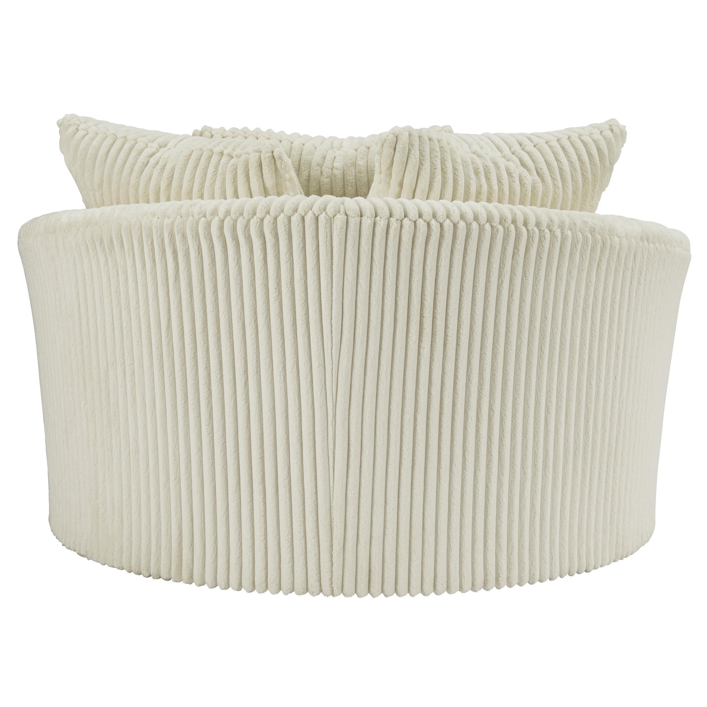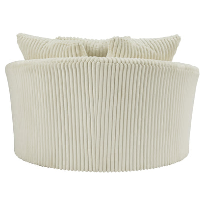 Plush and posh. Showcase your eye for on-trend texture with the statement-making cord upholstery of this oversized swivel accent chair. Its stunningly soft fabric entices in an ivory hue, complementing contemporary color palettes. Sink into the spacious cushion and plan to stay a while—this cozy living room chair highlights your high-end approach to comfort and style.
