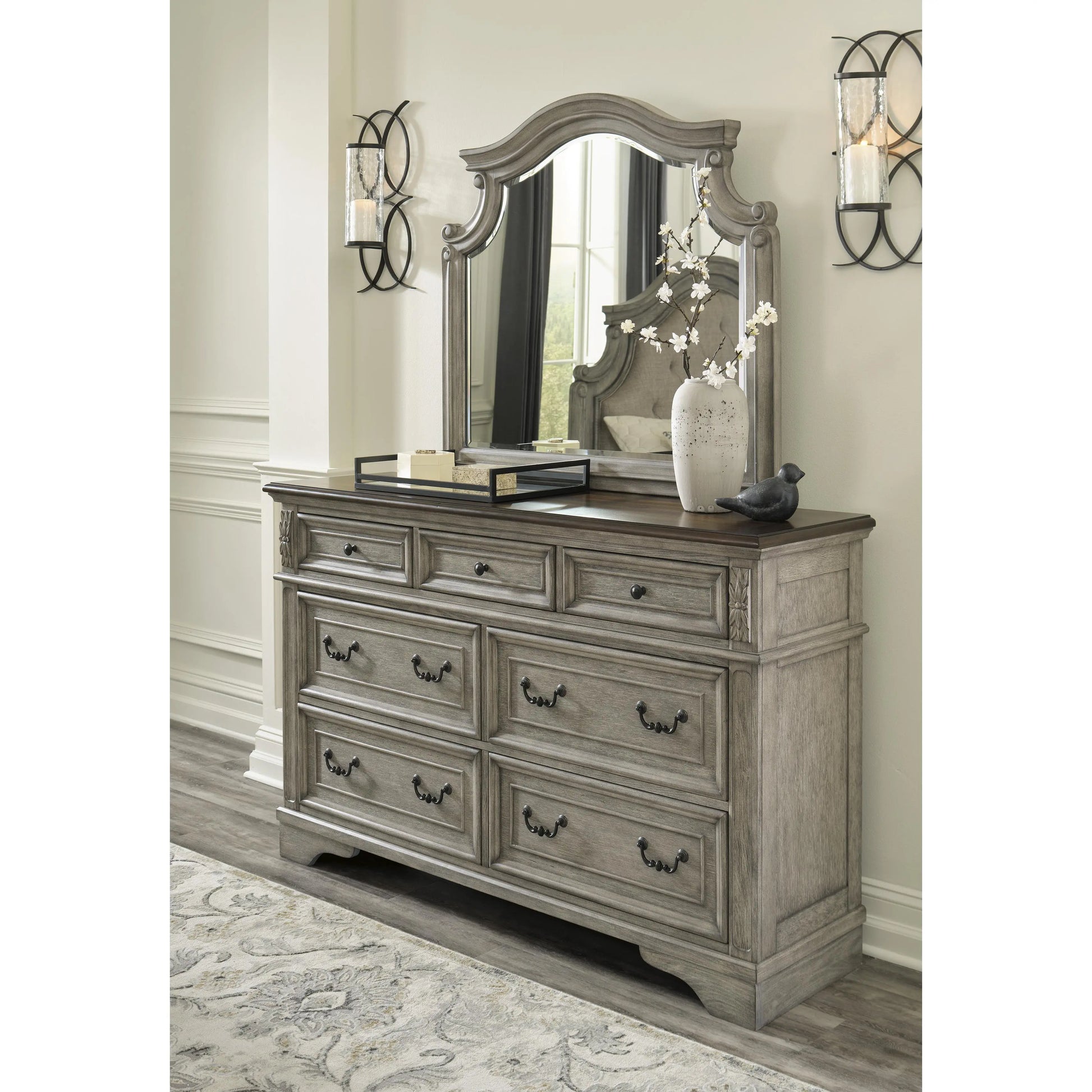 Cottage quaint styling and quality construction make this dresser with mirror a dream come true. A two-tone finish provides rustic warmth, with an antiqued gray body and a rich, deep walnut on the top. The framed drawer fronts, ornately shaped mirror and dark bronze-tone hardware marry classic elegance and homey charm. Seven smooth-gliding drawers are crafted with quality dovetail construction.