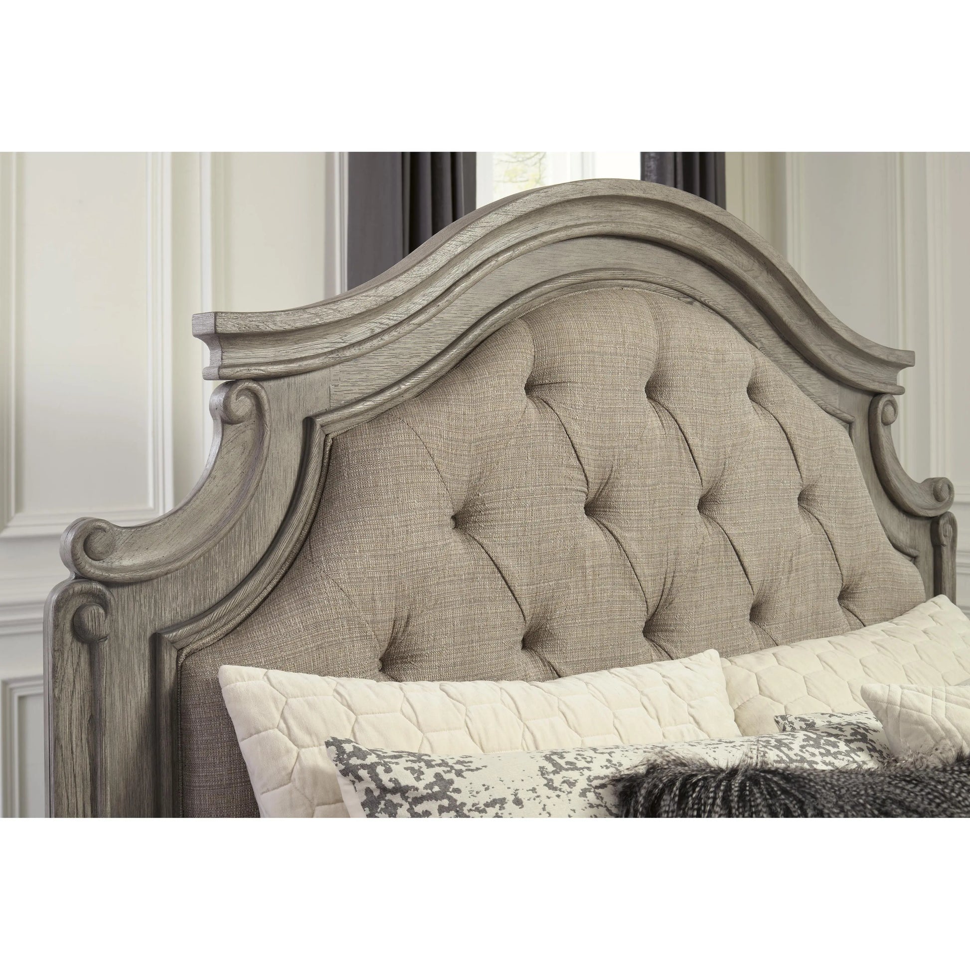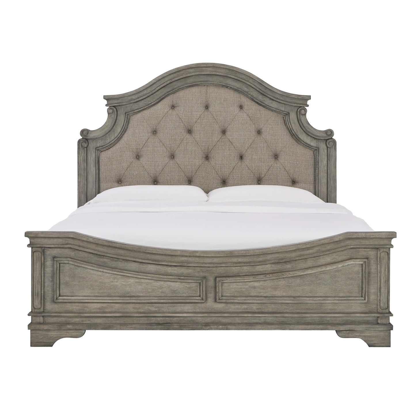 Cottage quaint styling and quality construction make this king panel bed a dream come true. An antiqued gray finish and beige upholstery provide rustic warmth. The ornately shaped headboard marries classic design with homey charm for an elegant bedroom must-have.