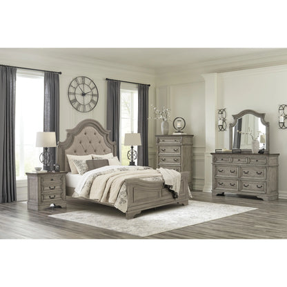 Cottage quaint styling and quality construction make this queen panel bed a dream come true. An antiqued gray finish and beige upholstery provide rustic warmth. The ornately shaped headboard marries classic design with homey charm for an elegant bedroom must-have.