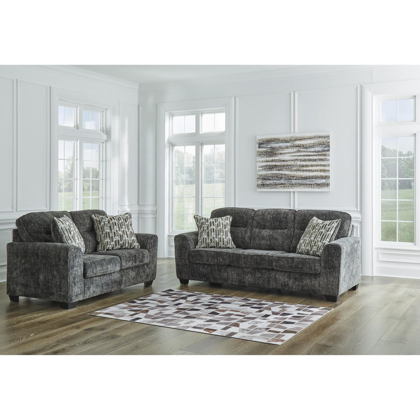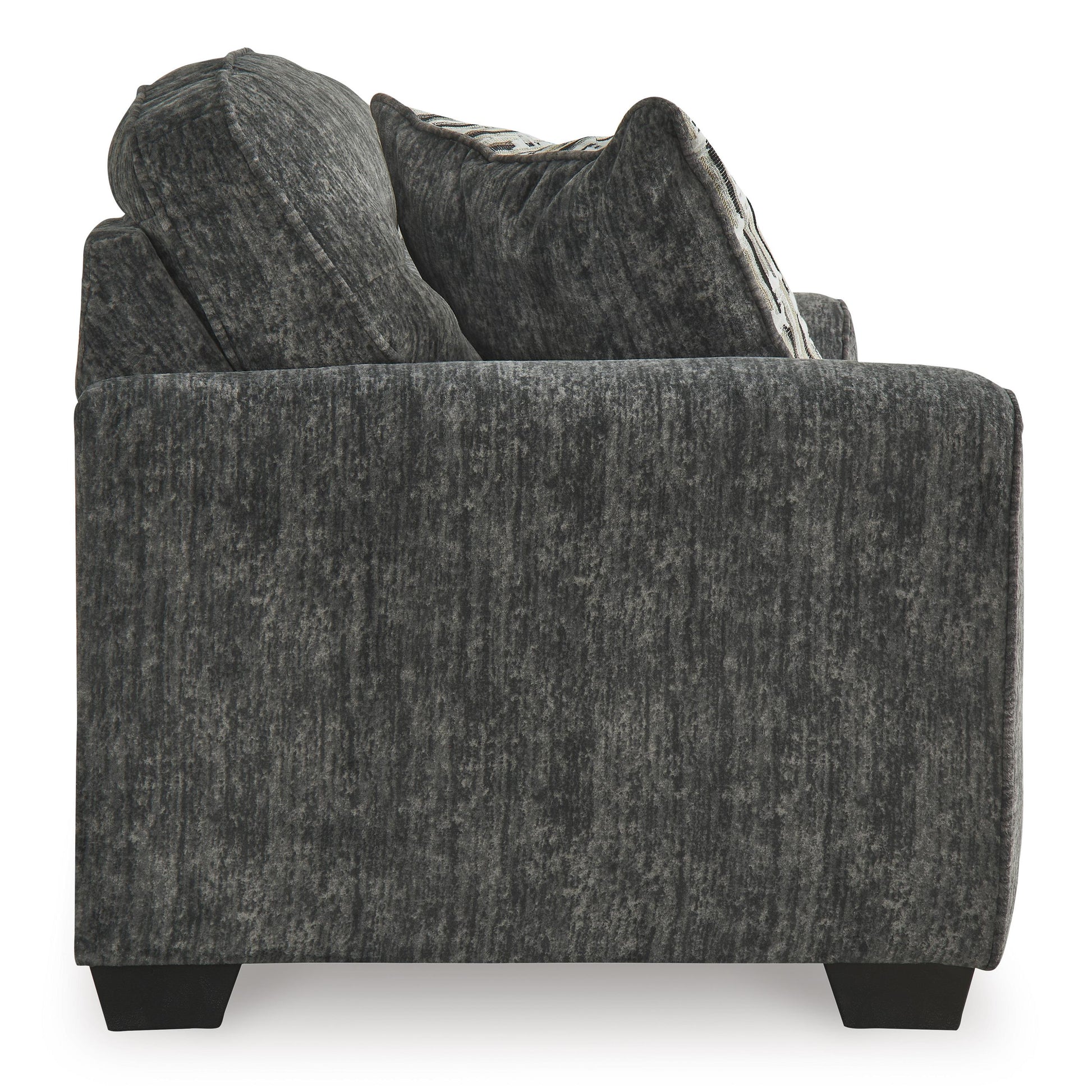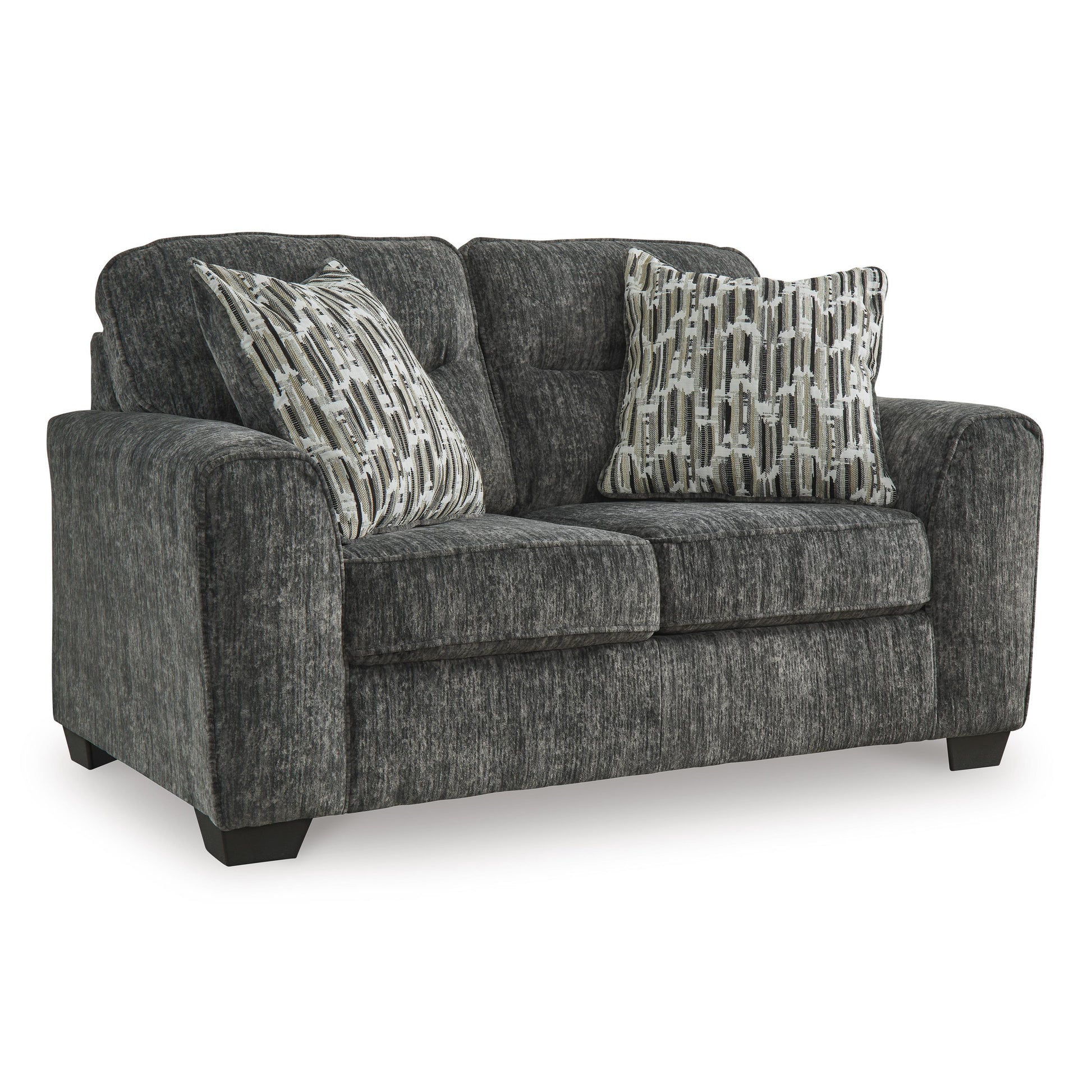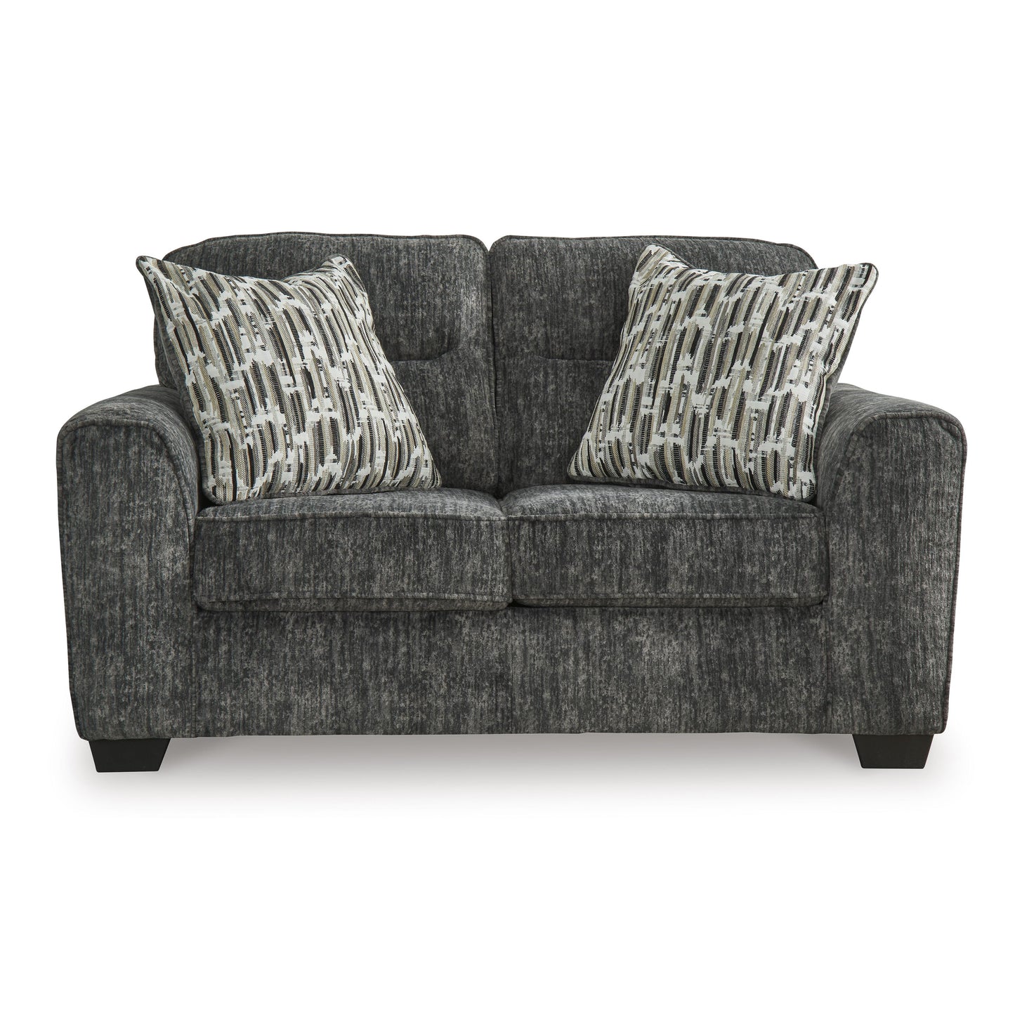 This loveseat speaks to those drawn to fresh, contemporary style with richly neutral appeal. Subtle and sophisticated, the plush upholstery and dark tri-block legs are a natural complement for so many color schemes. Two accent pillows make the seating even more welcoming. Curling up on this loveseat to enjoy a night in is never out of the question.