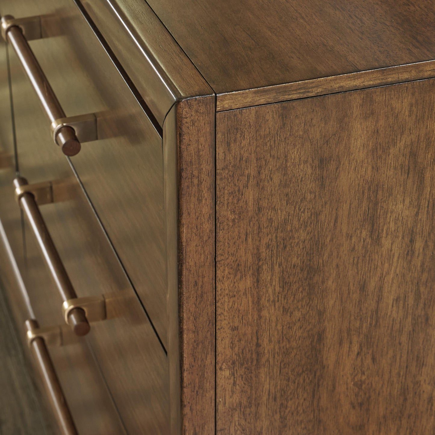 This dresser is perfect for contemporary or mid-century interiors. Its wood-tone finish is versatile and timeless. The drawers, designed with exquisite framing and elongated wooden pulls, enhance the overall aesthetic. Whether you want to refresh your entire bedroom or add a few key pieces, this is the ideal choice.
