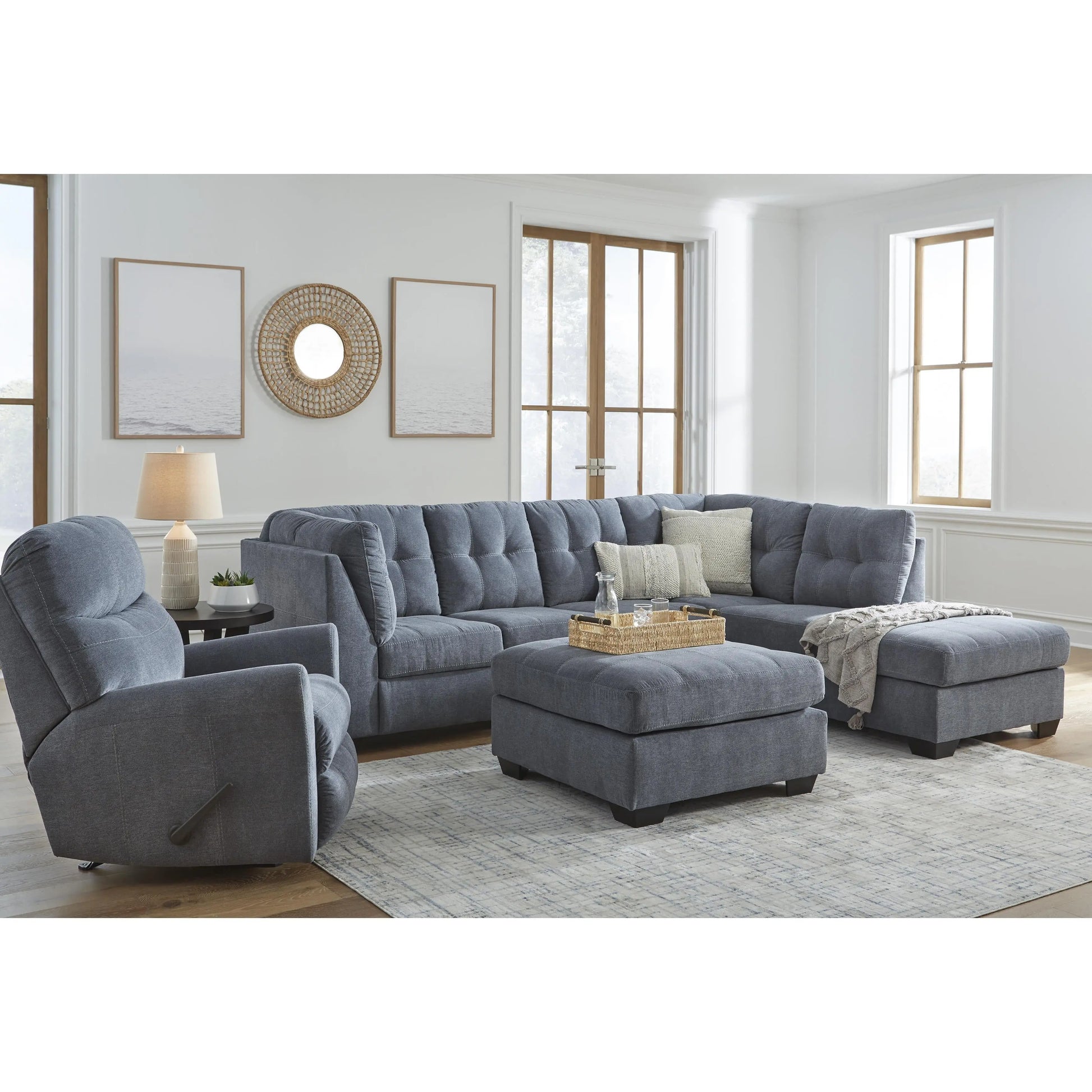 This sectional with chaise takes a homey approach to high style. Its denim-inspired fabric has classic versatility, while a contemporary silhouette and stitched details keep the look totally on trend. And you can count on comfort—the chaise invites you to kick back and stretch out.