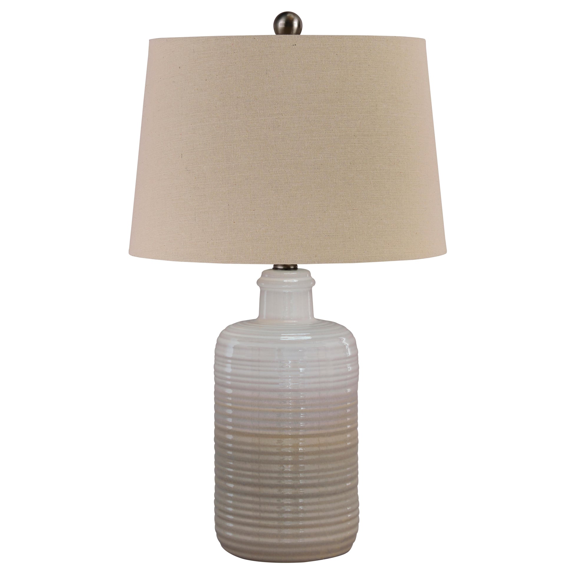 • Made of white and taupe glazed ceramic with modified drum shade