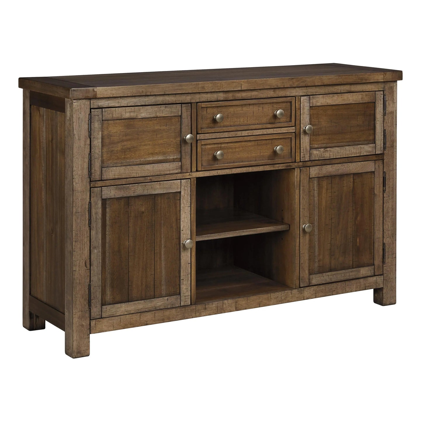 This dining room server might be simple at first sight, but a closer look reveals beauty in the details. With the plank-effect cabinet doors and table top, distressed nutmeg finish and antiqued bronze-tone hardware, it’s simply beaming with charm. The server’s mix of drawer, cabinet and shelf space will serve you well for years to come.