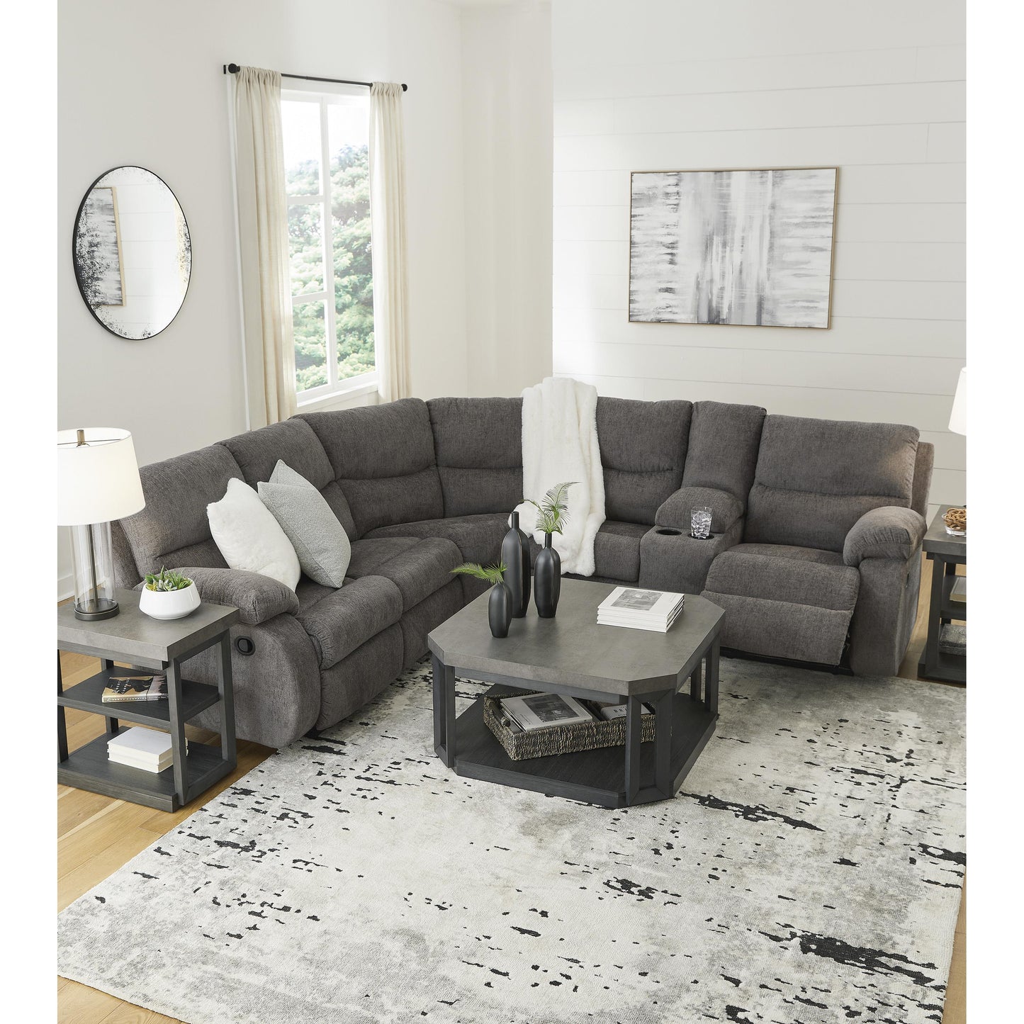 Cozy comfort is on the rise with this reclining sectional. So velvety soft, the trendy pewter-hued chenille upholstery is made for everyday indulgence. Overstuffed and stylishly wrapped, the sumptuous cushions and pillow top armrests display the comfortable side of contemporary. A padded center console with hidden storage and dual cup holders blends form and function. And with one easy pull, you're on your way to endless relaxation with plenty of room to stretch out.