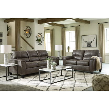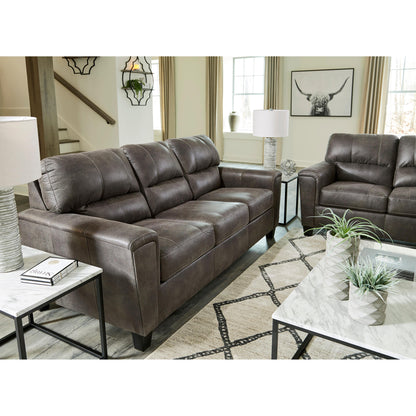 If you love the cool look of leather but long for the warm feel of fabric, you can take comfort in this sofa. Wrapped in a fabulous faux leather with a weathered hue and hint of pebbly texture to resemble the real deal, this decidedly modern sofa proves less is more. Elements include angled side profiling and track armrests wrapped with a layer of pillowy softness for that little something extra. Prominent jumbo stitching and clean-lined divided back styling lend fashion-forward flair.