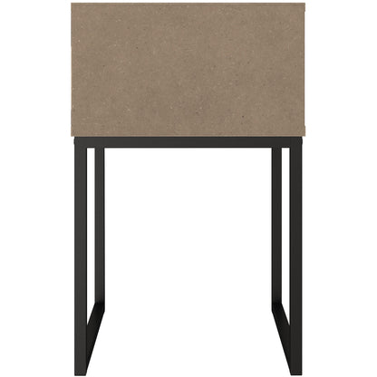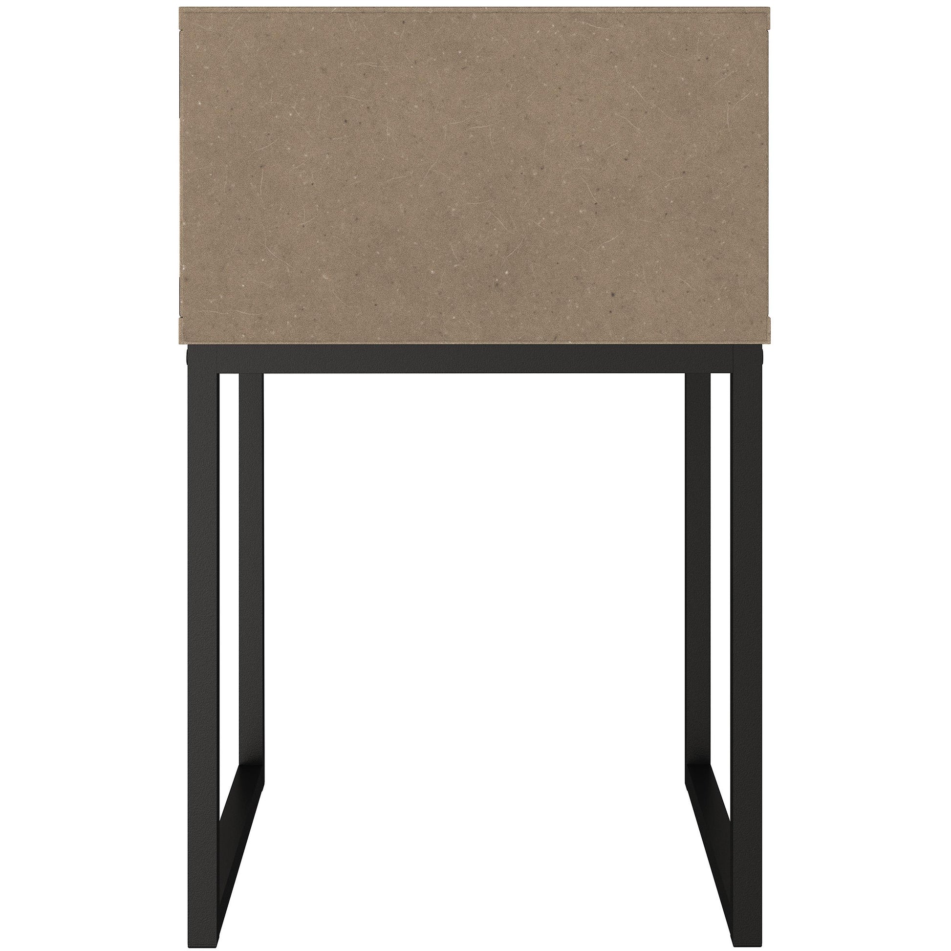 Streamlined design and a stunning finish come together in one simply extraordinary piece. This single drawer nightstand is sure to impress with canted metal legs and a rustic butcher block finish over replicated pine grain texture. Its mid-century profile is a nod to the past, while the updated finish keeps it solidly in the present.