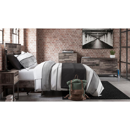 Streamlined design and a stunning finish come together in one simply extraordinary bed. This queen panel bed is sure to impress with platform styling and a rich brown finish over replicated pine grain texture. Its mid-century profile is a nod to the past, while the updated finish keeps it solidly in the present.