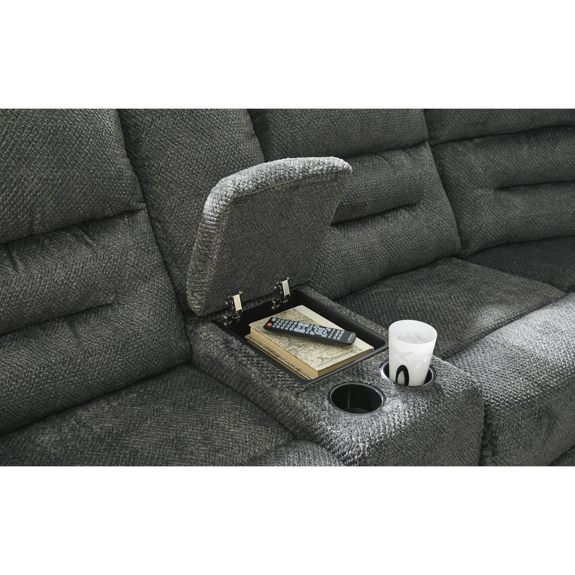 • Console with 2 cup holders and hidden storage