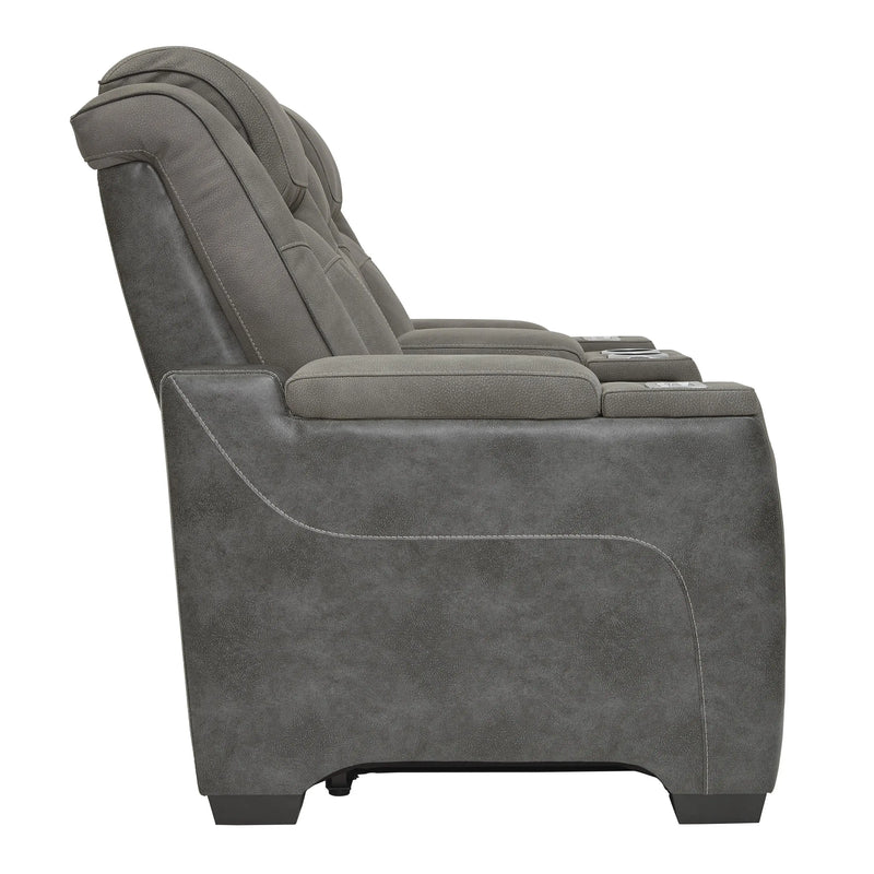 This sleek, ultra-modern power reclining loveseat with console has it all. With designer style and head-to-toe comfort, it has the upscale look of leather at a scaled-down faux leather price. Its gray two-tone upholstery is more durable and water-repellent than regular leather, an added bonus for families. Features including wireless and USB charging, an adjustable headrest and an extended ottoman make this the next generation of power recliners.