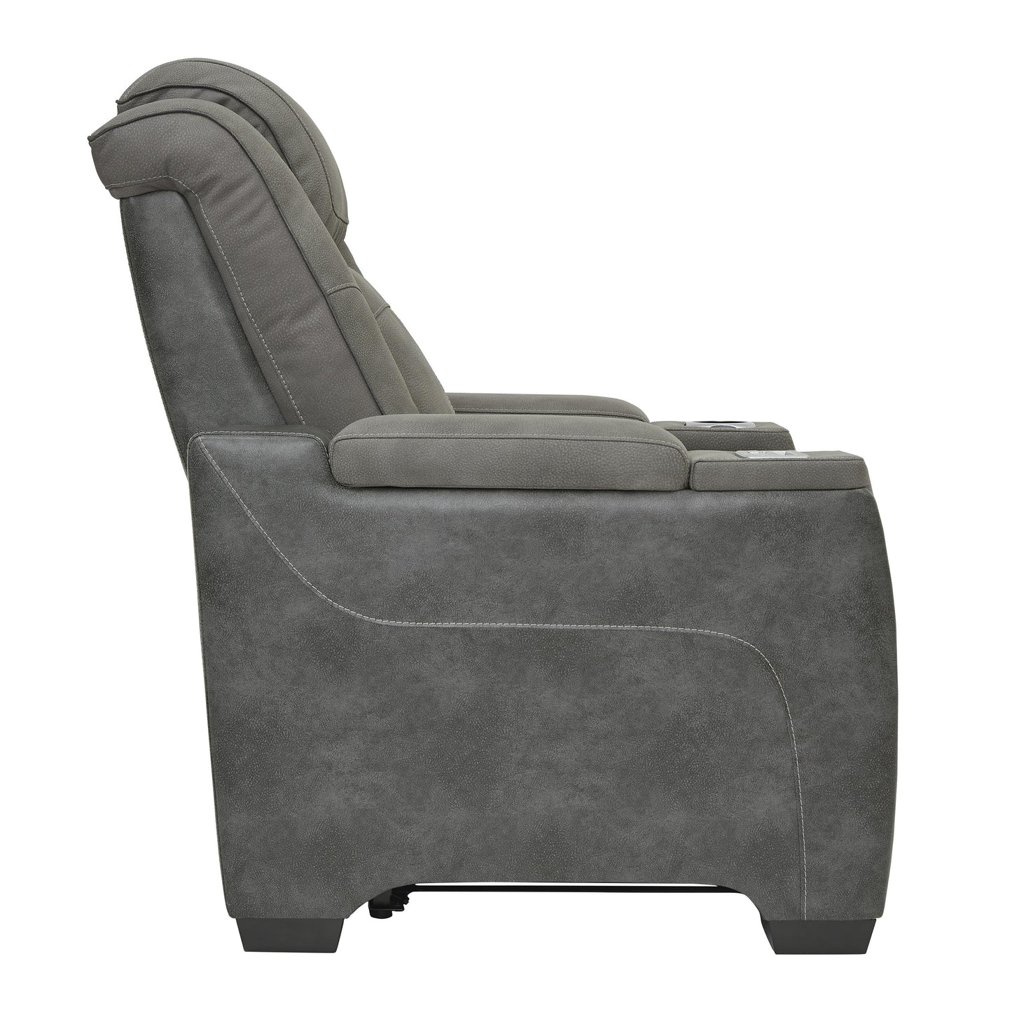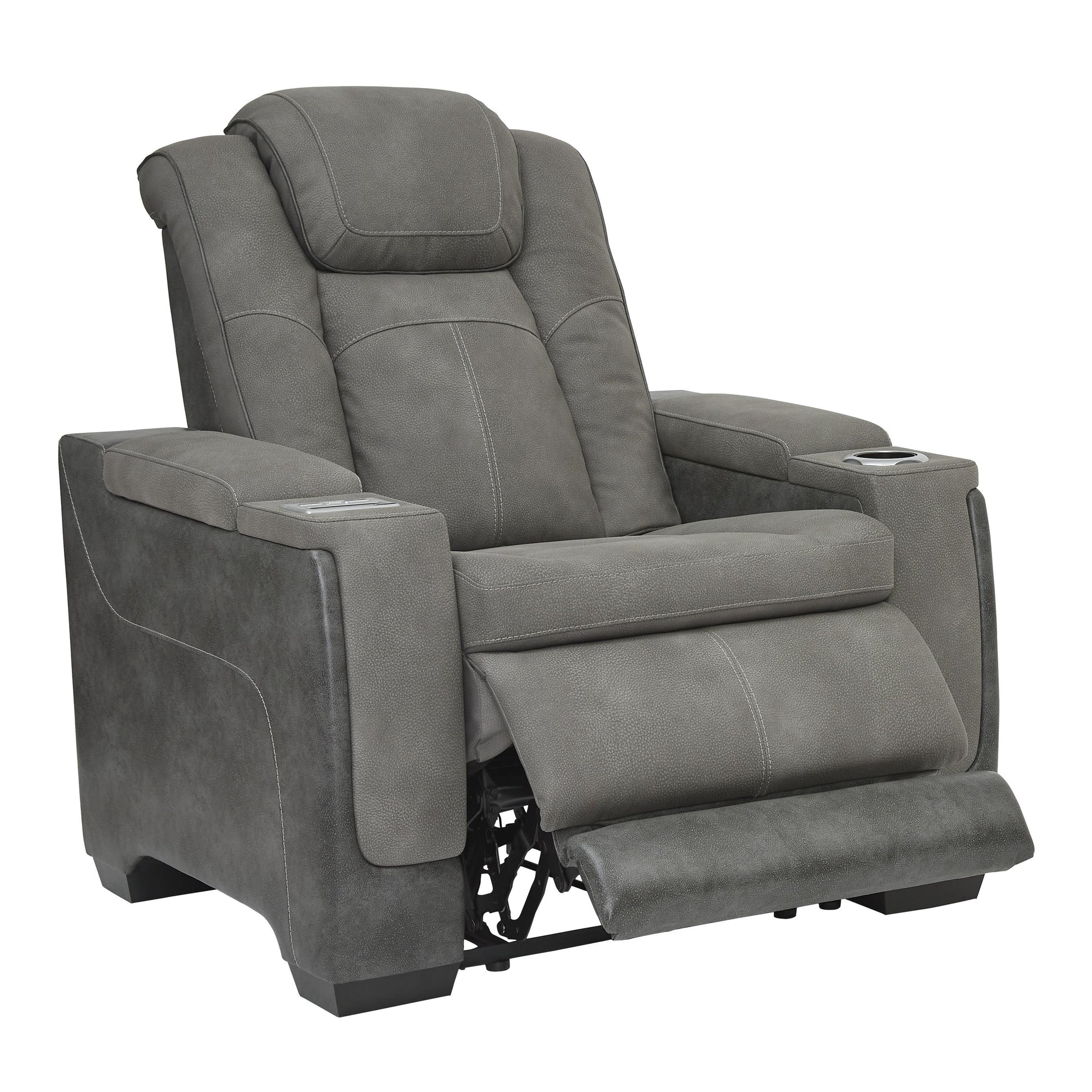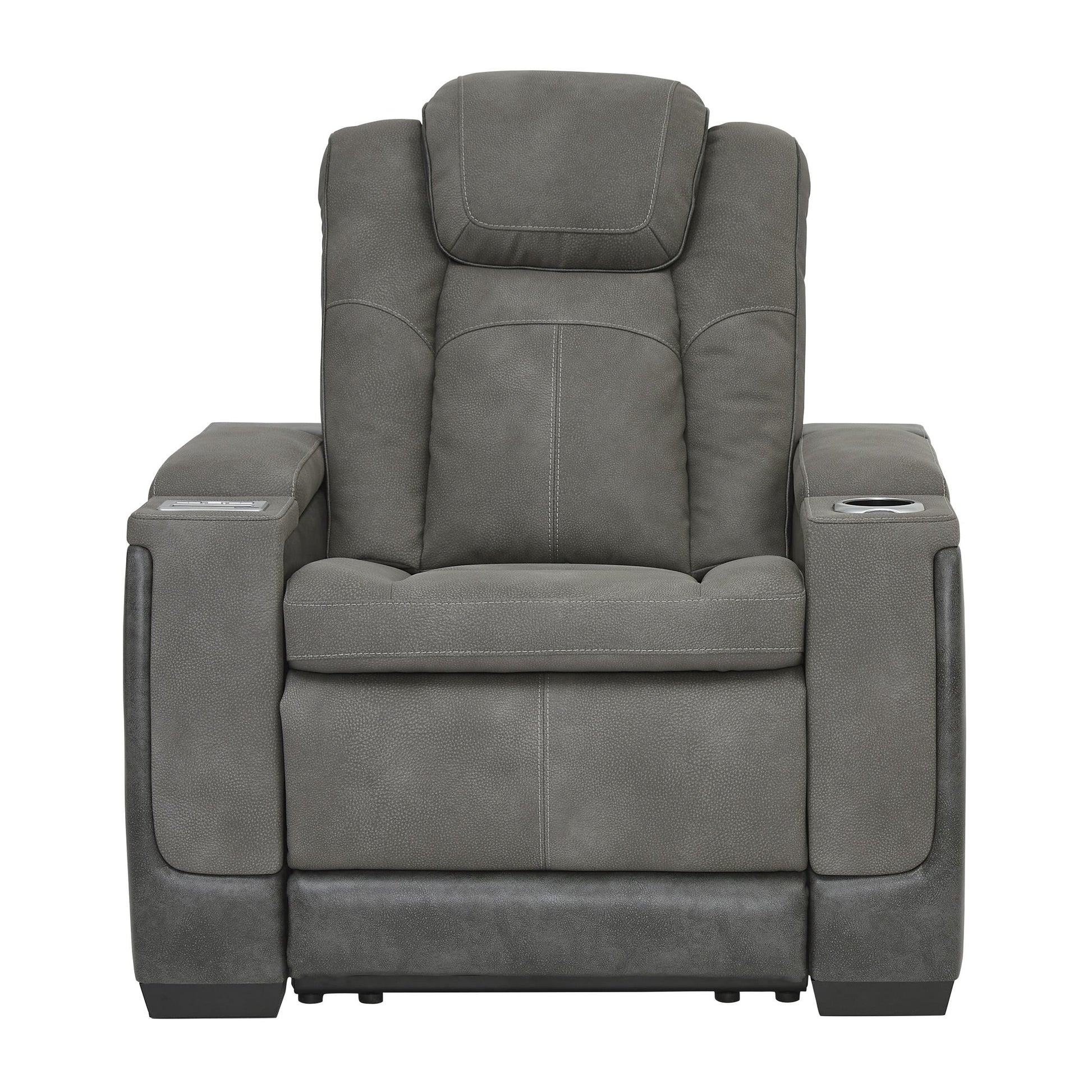 This sleek, ultra-modern power recliner has it all. With designer style and head-to-toe comfort, it has the upscale look of leather at a scaled-down faux leather price. Its gray two-tone upholstery is more durable and water-repellent than regular leather, an added bonus for families. Features including wireless and USB charging, an adjustable headrest and an extended ottoman make this the next generation of power recliners.