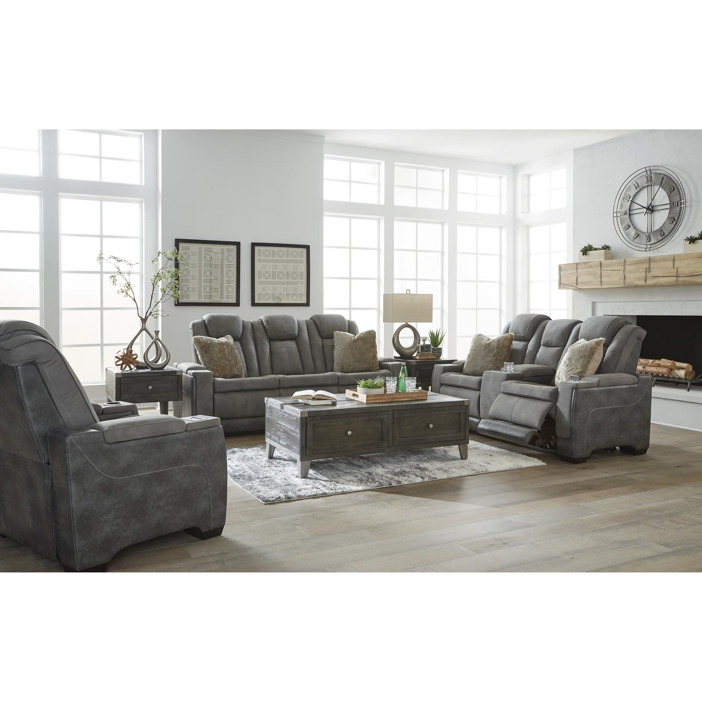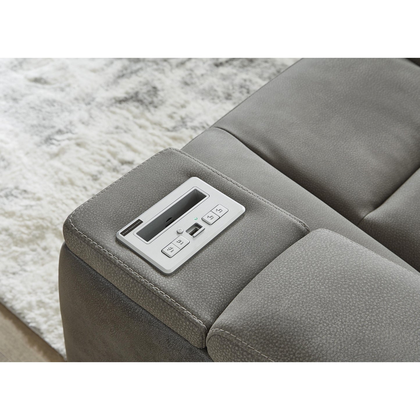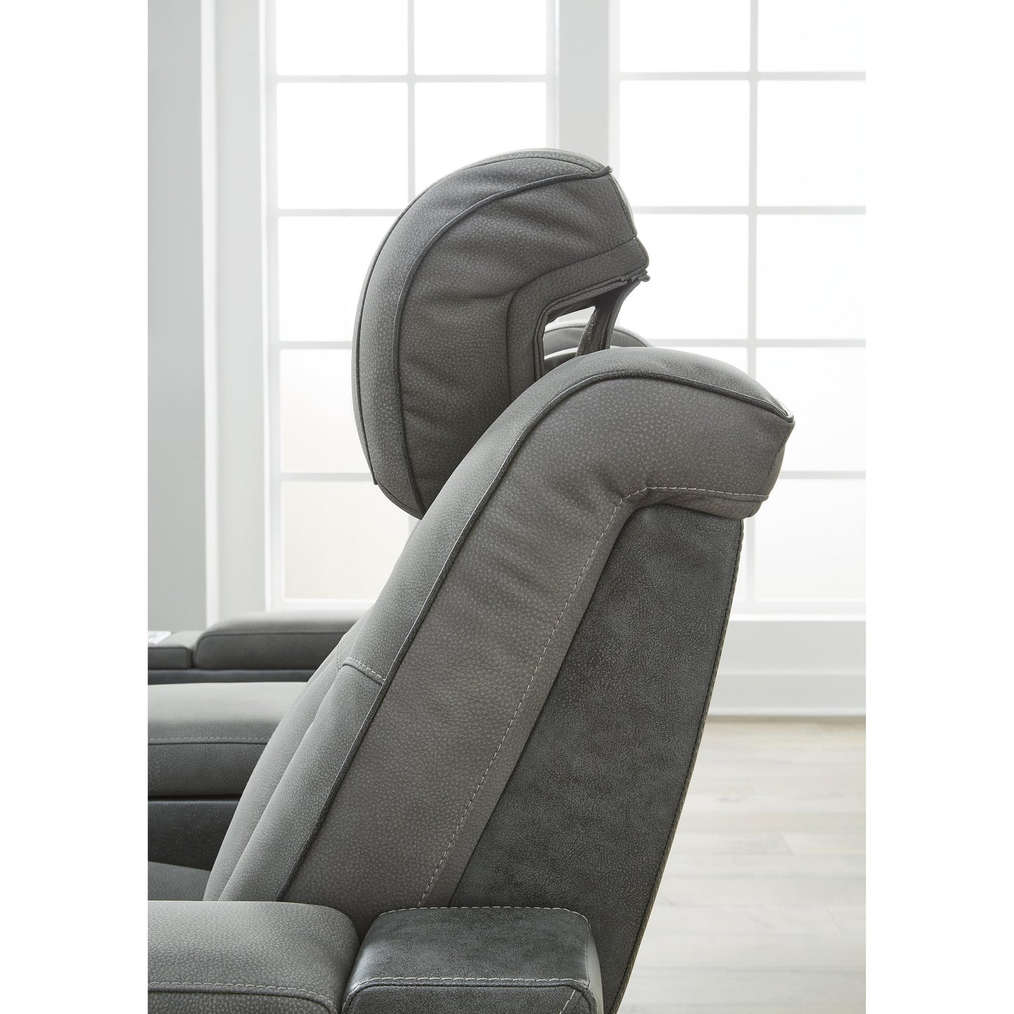 This sleek, ultra-modern power recliner has it all. With designer style and head-to-toe comfort, it has the upscale look of leather at a scaled-down faux leather price. Its gray two-tone upholstery is more durable and water-repellent than regular leather, an added bonus for families. Features including wireless and USB charging, an adjustable headrest and an extended ottoman make this the next generation of power recliners.