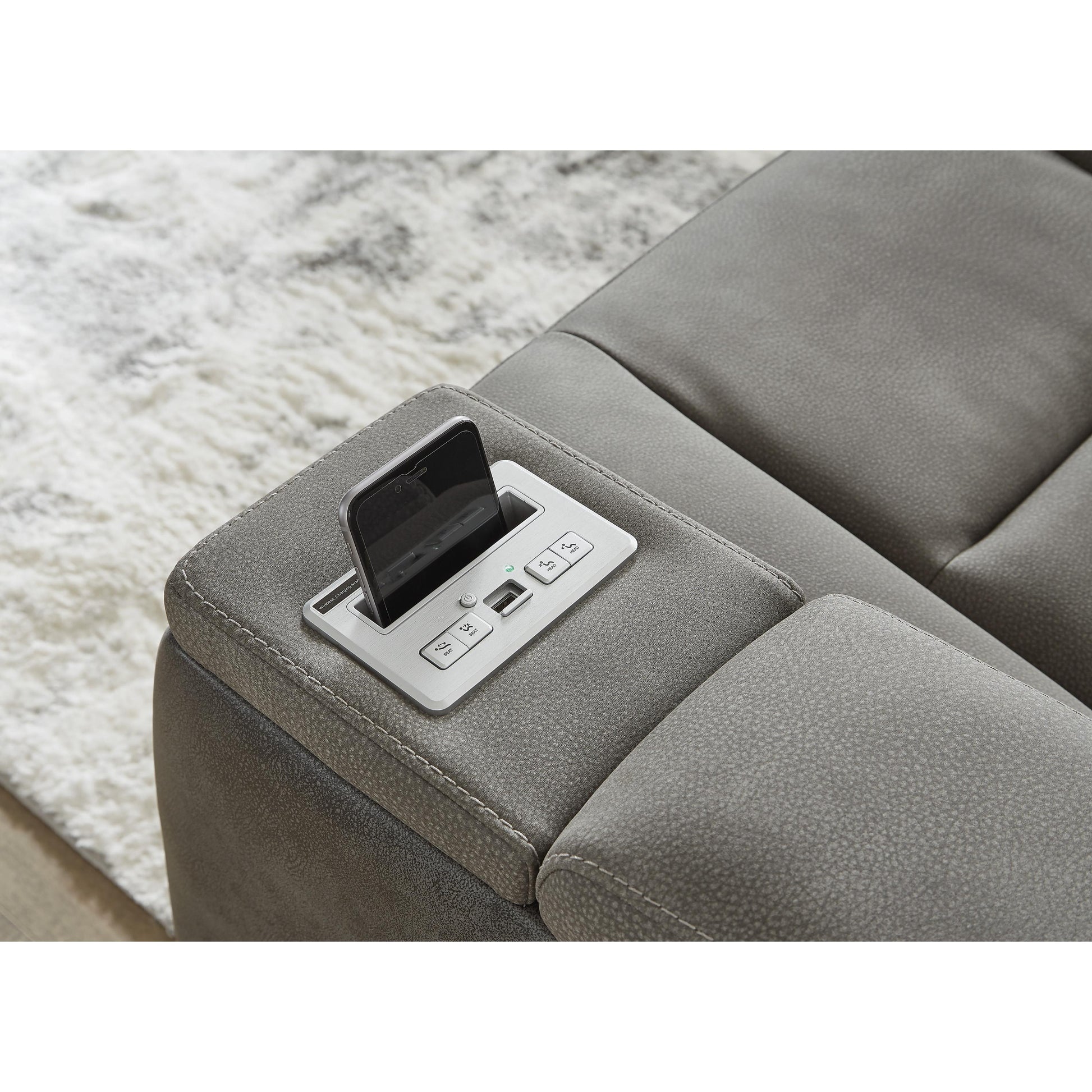 • Storage armrests with cup holder and wireless and USB charging