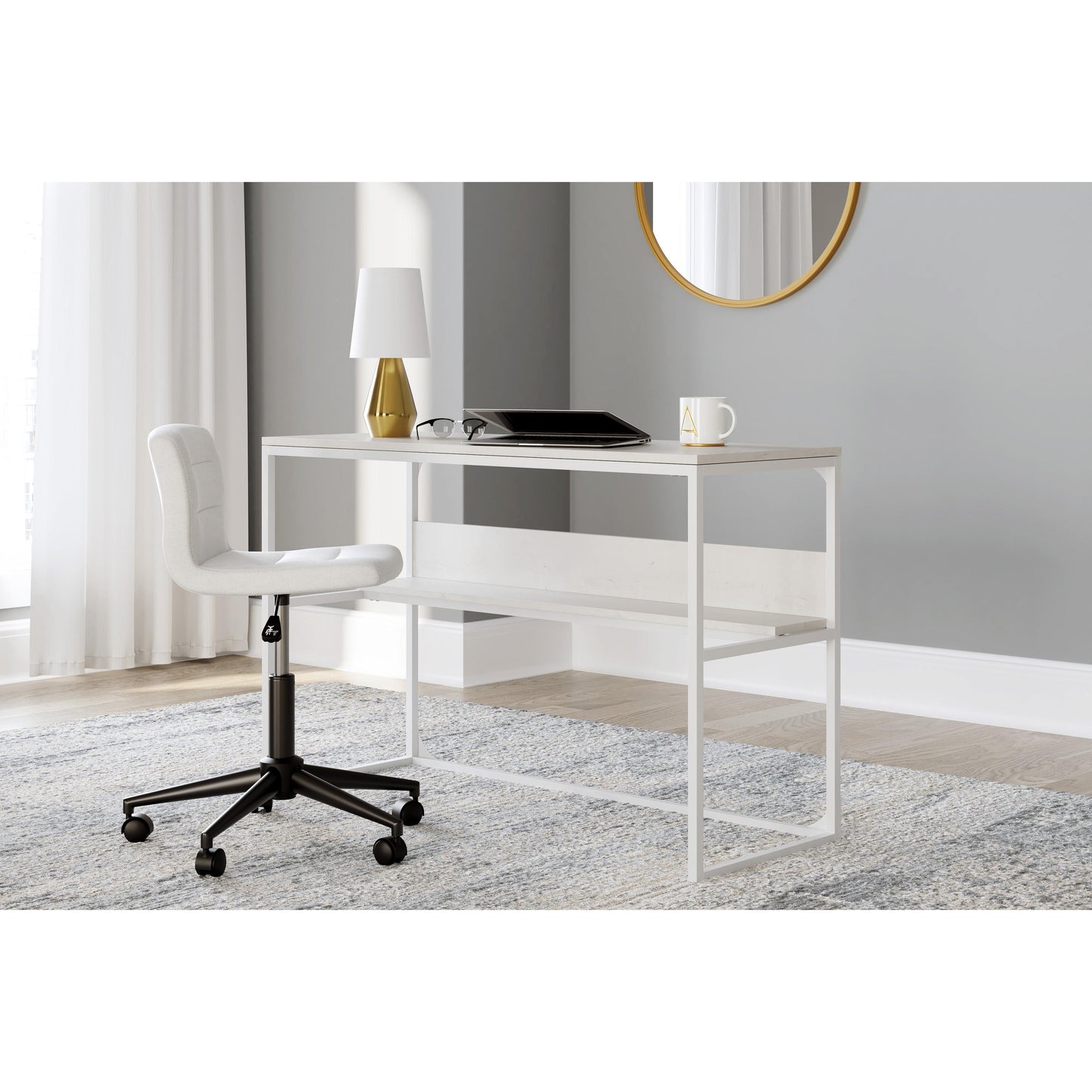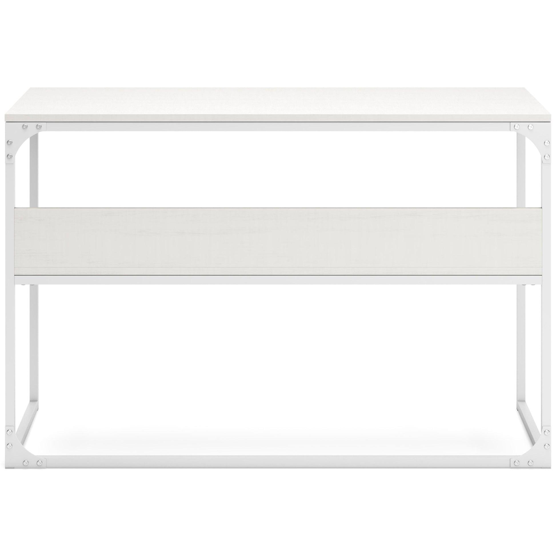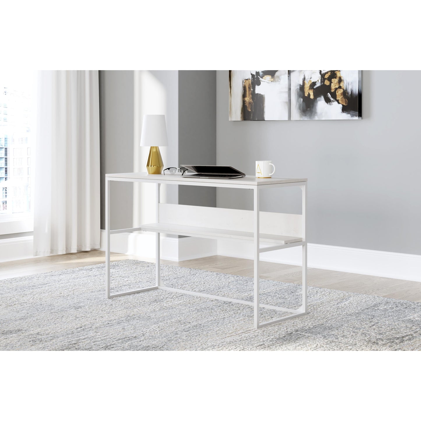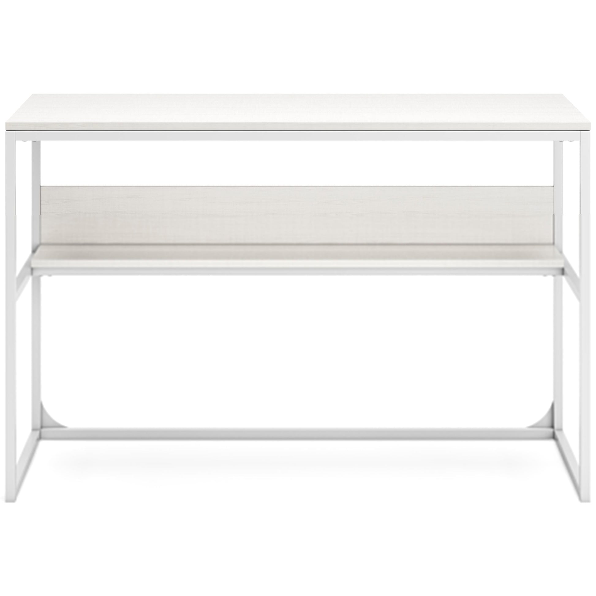 Bring your vision of a modern home workspace to life with this sleekly designed home office desk. Its linear construction and white finish keep things minimal. A small shelf along the back rounds out the versatile, striking desk.