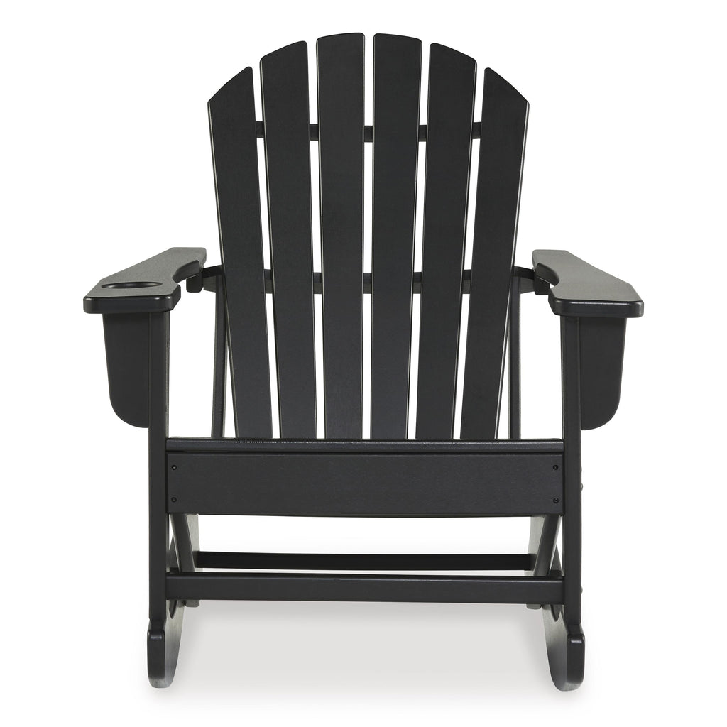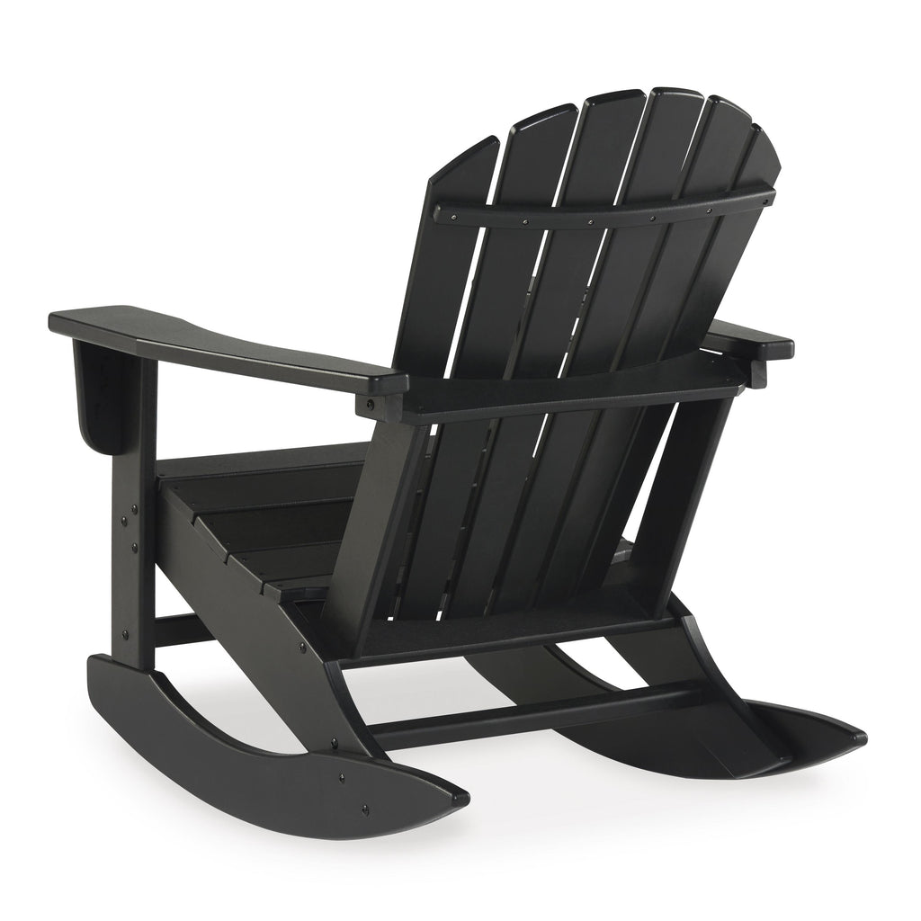Add cottage-quaint charm to your outdoor oasis with this rocking chair in black. Made of MEGA-TUFF® high-density polyethylene material, it’s sure to weather the seasons beautifully. Designed to shed rainwater, the chair’s slatted styling and classic Adirondack design provide exceptional form and function.