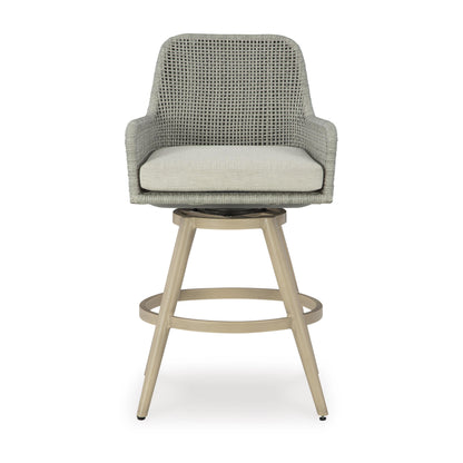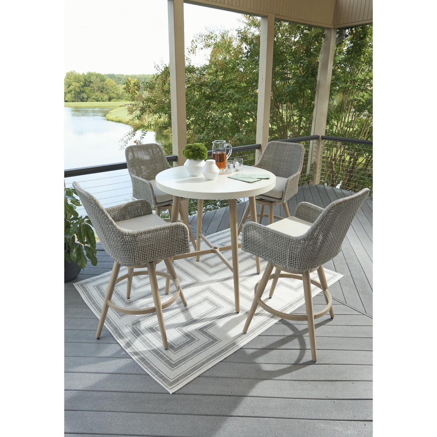 This swivel bar stool invites your casual contemporary style outdoors. With its resin wicker in a chic neutral hue, it expertly marries refined design with durability. The 360-degree swivel makes it easy to switch from watching the kids at the pool to grabbing a drink from the table. And breezy summer mornings and cold winter nights are made all the more comfortable with high-performance Nuvella+™ fabric covering the seat cushion.
