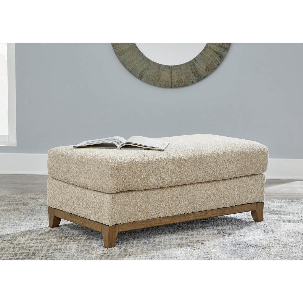 Serene style with a modern sensibility. Delight in the cozy, versatile embrace of this ottoman. It takes an on-trend approach to irresistible texture and natural beauty, showcasing soft upholstery accented with a transitional wood trim. As refined as it is laid back, the ottoman also keeps comfort a priority with a plush, thick cushion.