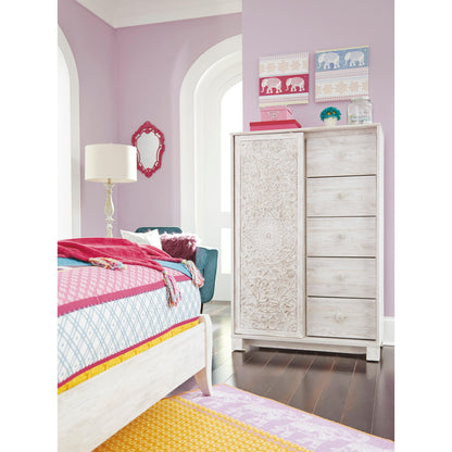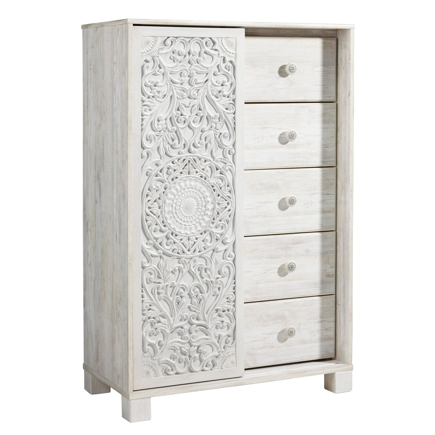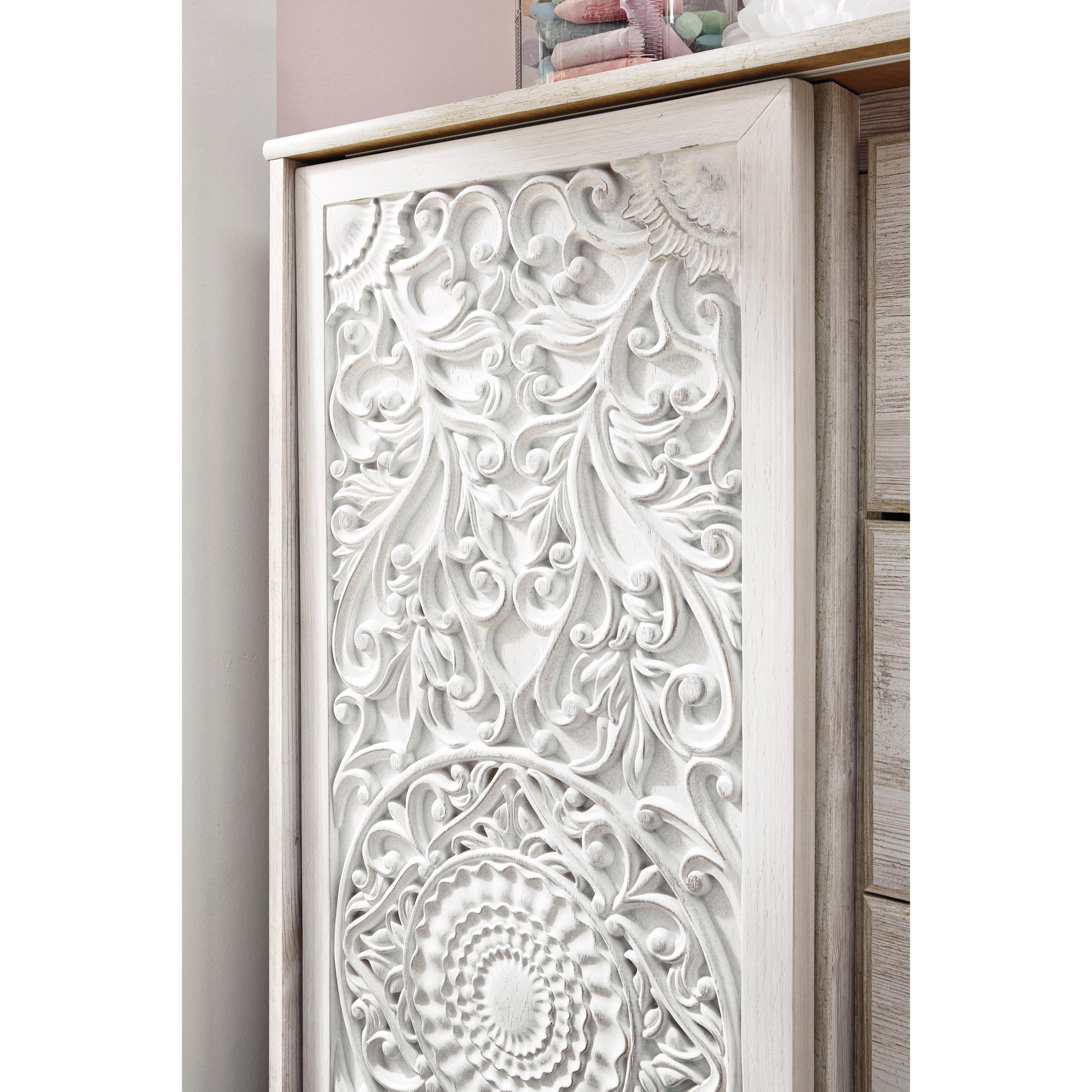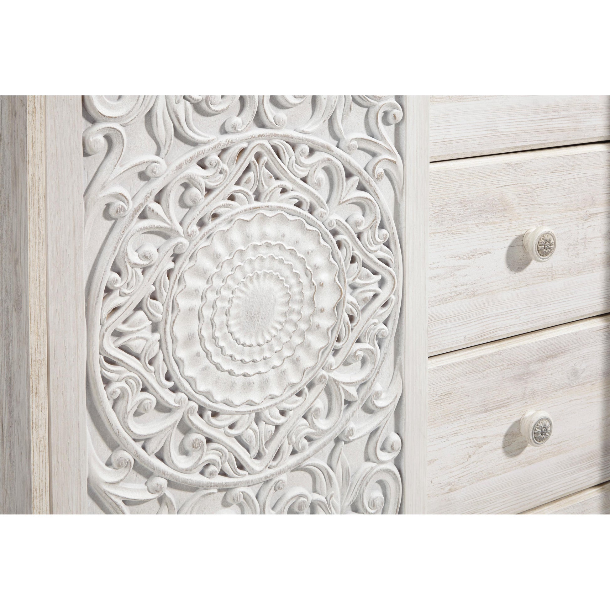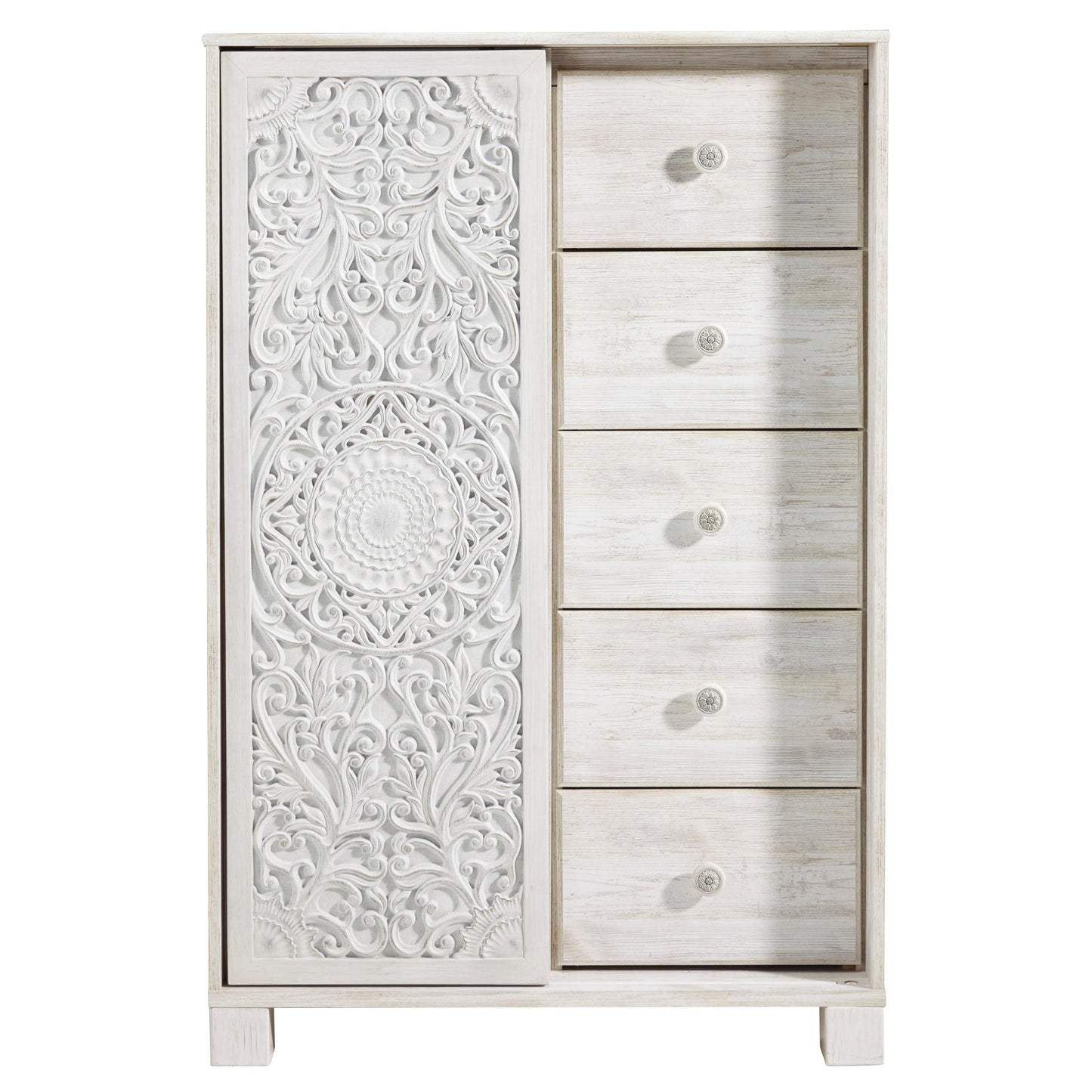 A one-of-a-kind girl deserves a bedroom retreat that celebrates her personal flair—and this boho-chic chest of drawers is so befitting. Wowing with an artful, carved-effect sliding door and richly distressed whitewash finish, this five-drawer chest with additional shelved storage is packed with possibilities.