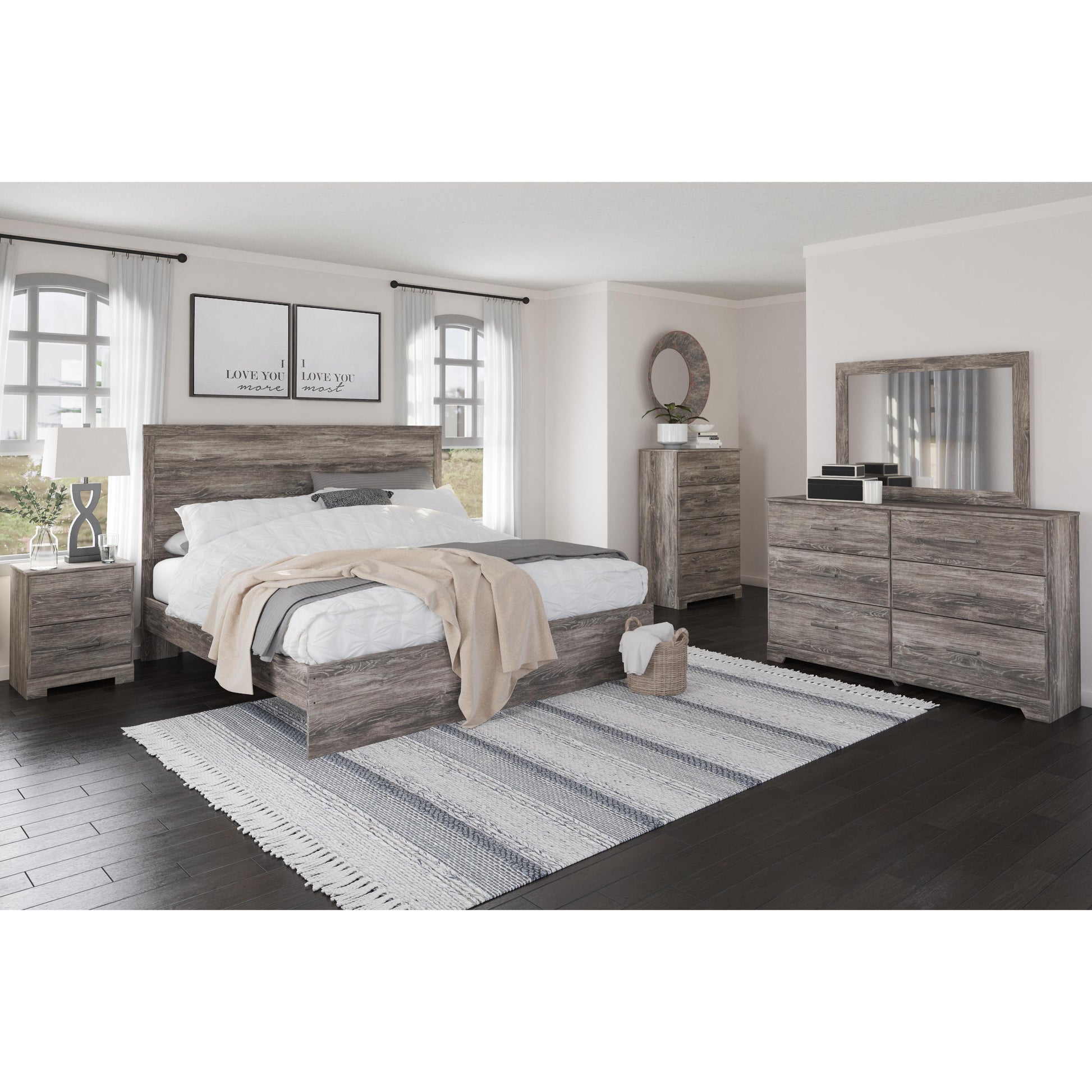 With its clean-lined look and modern attitude, this dresser and mirror is a fresh style awakening. A warm gray hue over replicated oak grain easily complements other furniture finishes. Smooth drawer fronts with antiqued pewter-tone handles complete the aesthetic.