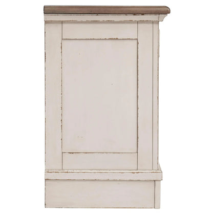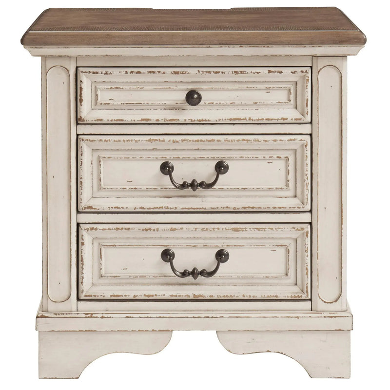 Elevating the art of traditional cottage styling, this nightstand is your dream bedroom retreat realized. Its antiqued two-tone aesthetic blends a chipped white with a distressed wood finished top for added charm. Framed drawer fronts and decorative corbels add refinement, while bail pulls in a dark bronze-tone finish lend a classic touch. Subtly placed USB/electrical outlets meld vintage inspiration with modern convenience.