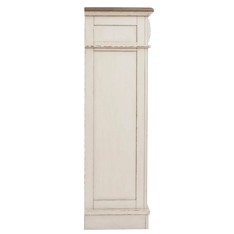 Elevating the art of traditional cottage styling, this chest of drawers is your dream bedroom retreat realized. Its antiqued two-tone aesthetic blends a chipped white with a distressed wood finished top for added charm. Framed drawer fronts and decorative corbels add refinement, while bail pulls in a dark bronze-tone finish lend a classic touch.