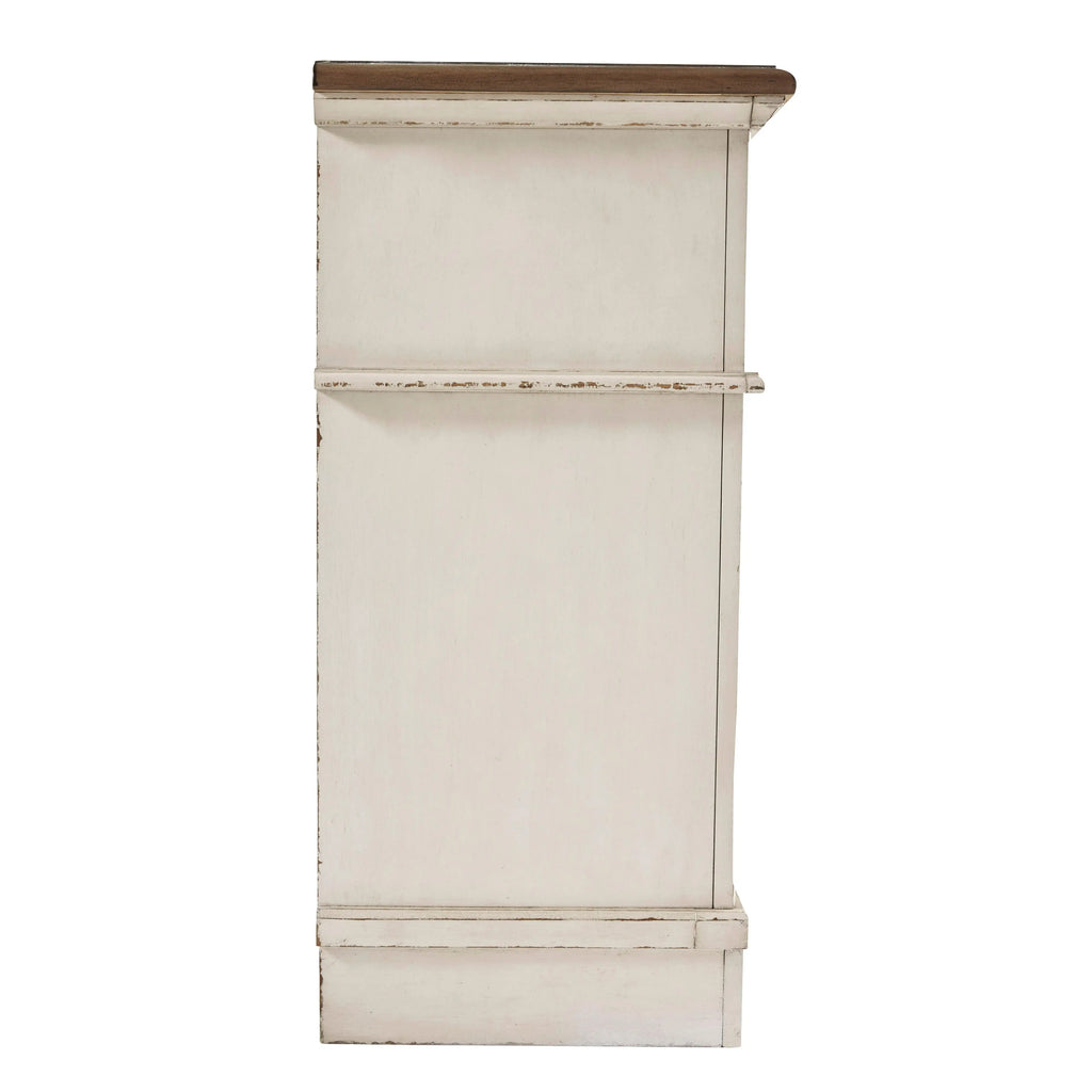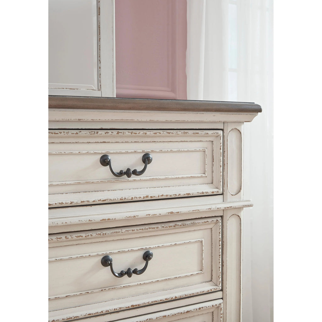 Elevating the art of traditional cottage styling, this dresser is your dream bedroom retreat realized. Its antiqued two-tone aesthetic blends a chipped white with a distressed wood finished top for added charm. Framed drawer fronts and decorative corbels add refinement, while bail pulls in a dark bronze-tone finish lend a classic touch.