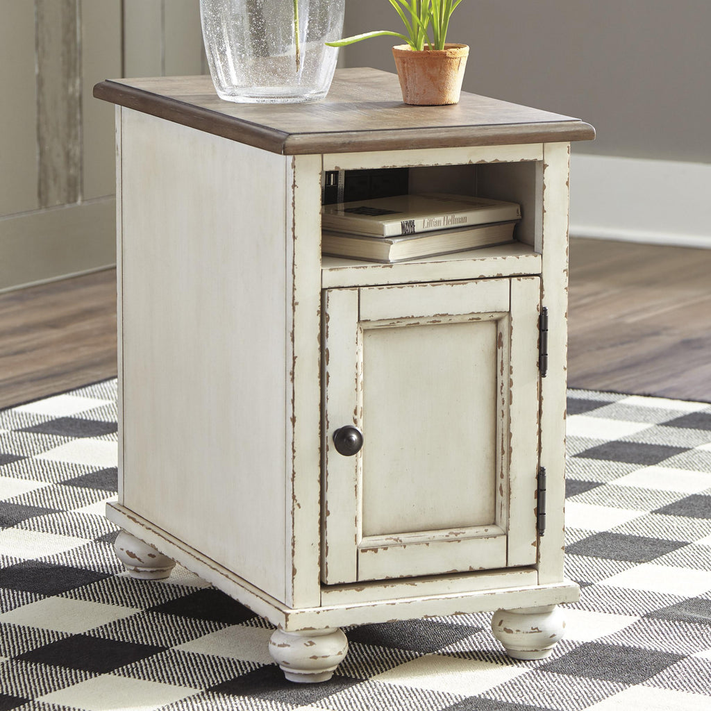 This chairside end table is traditional cottage styling made for modern living. Antiqued two-tone finish blends a chipped white with a distressed wood finished top for a double serving of charm. Cleverly placed AC power outlets and USB charging ports are beautifully in tune with your high-tech needs.