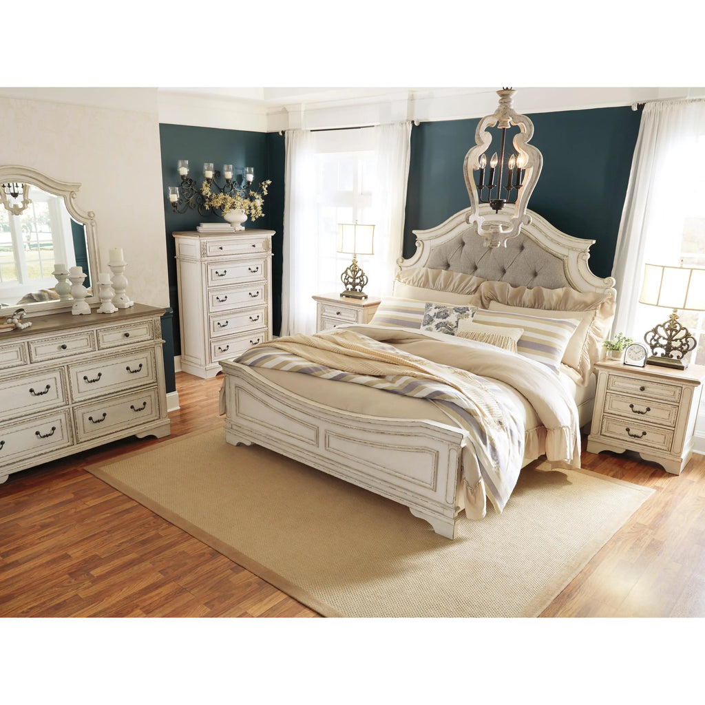 Elevating the art of traditional cottage styling, this queen upholstered bed is your dream bedroom retreat realized. A curvaceous beauty, this brilliant upholstered bed wows with dramatic scalloped details and fanciful trim work. The distressed chipped white finish charms with its heirloom appeal. Deep tufting on the cushioned upholstered headboard adds such a cozy element sure to put you at ease. Mattress and foundation/box spring available, sold separately.
