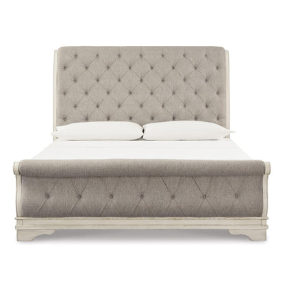 Elevating the art of traditional cottage styling, this queen upholstered sleigh bed is your dream bedroom retreat realized. A curvaceous beauty, this brilliant upholstered bed wows with a chipped white finish for heirloom appeal. Deep tufting on the cushioned upholstered headboard and footboard adds such a cozy element sure to put you at ease. Mattress and foundation/box spring available, sold separately.