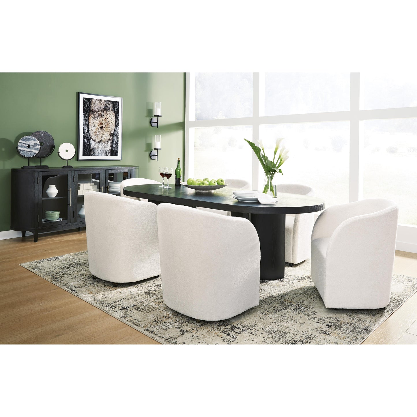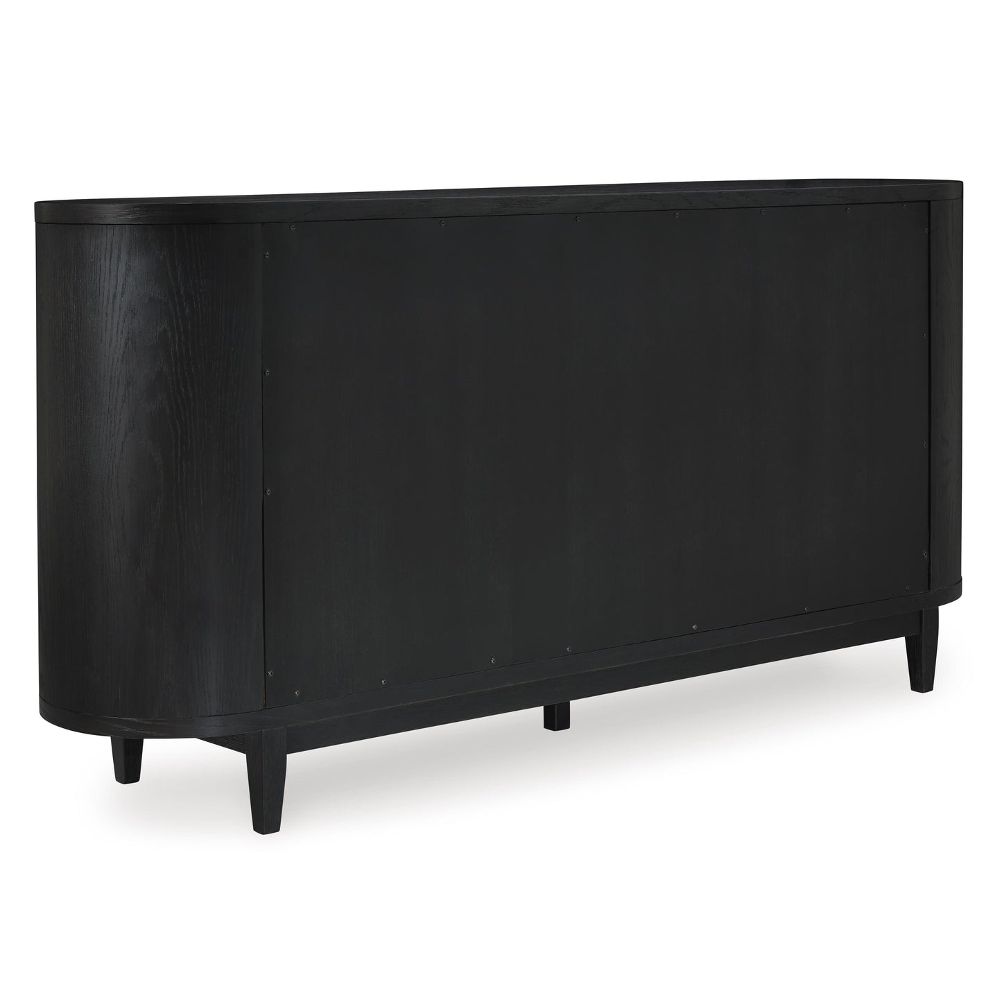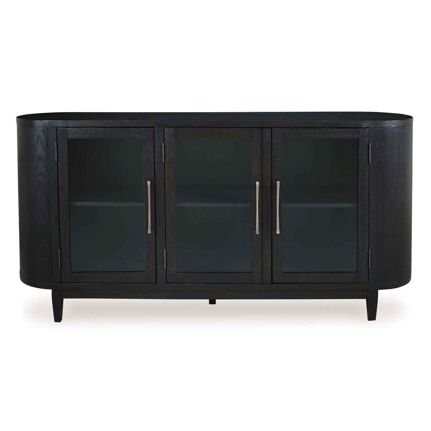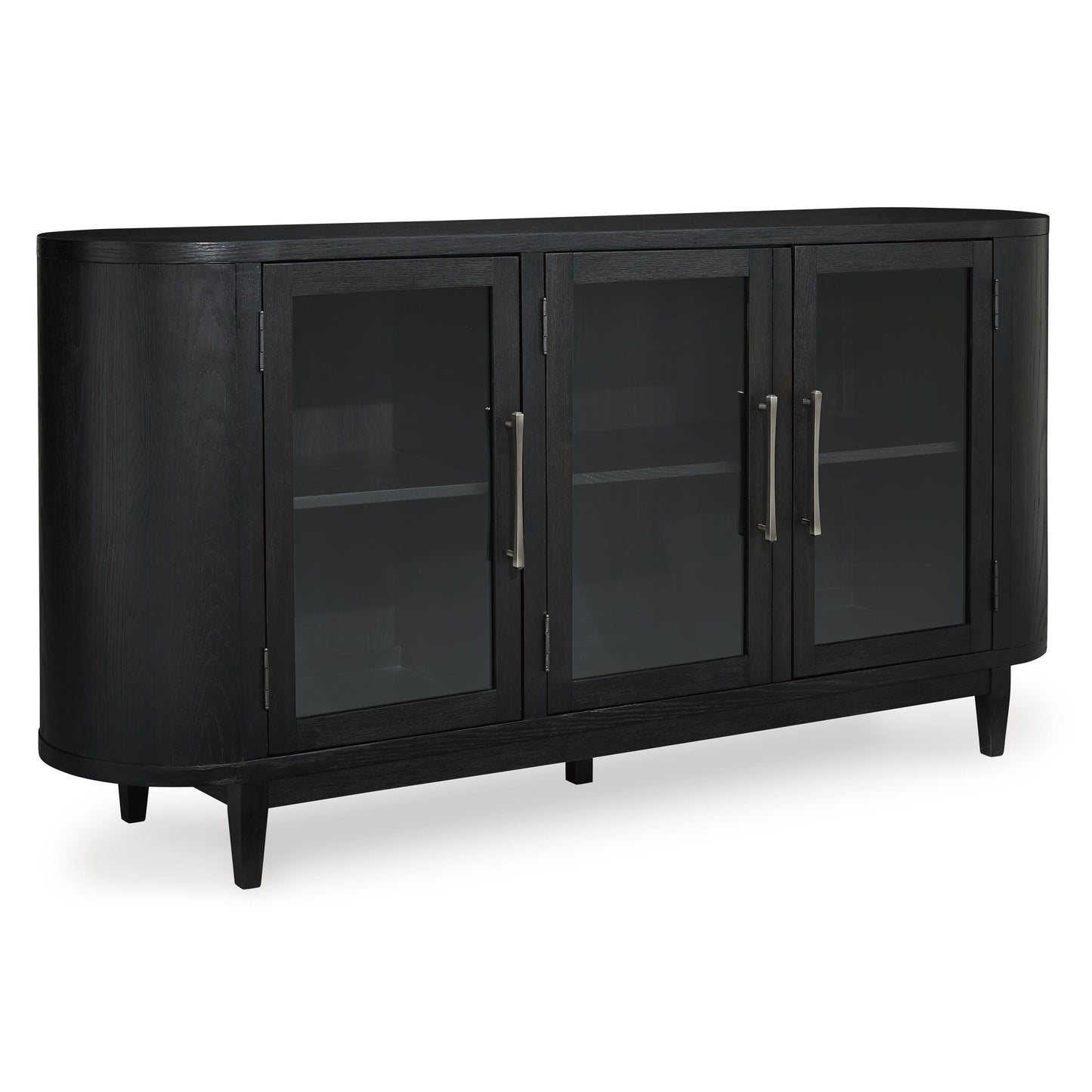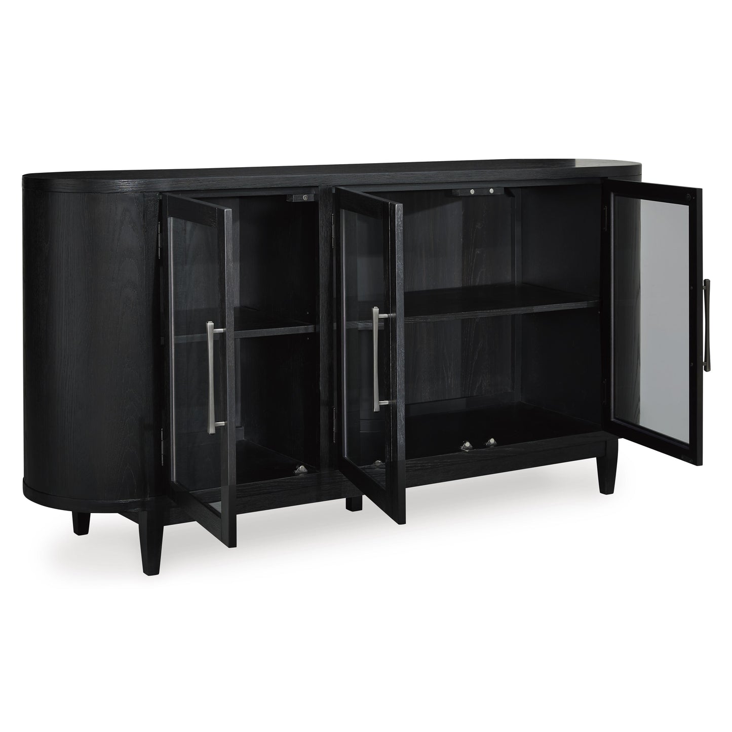 Inspired by art deco design, this dining server makes a lasting impression in a simply stunning way. Its magnificent rounded silhouette is enhanced with a rich layered black finish on the textured wood grain surface. Complete with glass cabinet doors, interior shelving and tapered legs, it’s the contemporary statement piece you’ve been seeking to elevate late-night dinners and full-on family feasts.